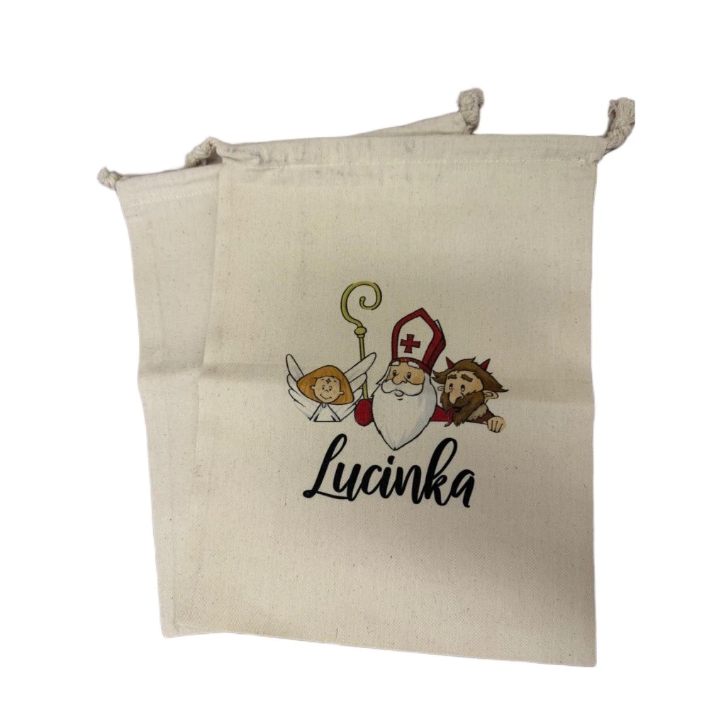 Bavlněný pytlík s Mikulášem a jménem Lucinka čeká na svého nového majitele.