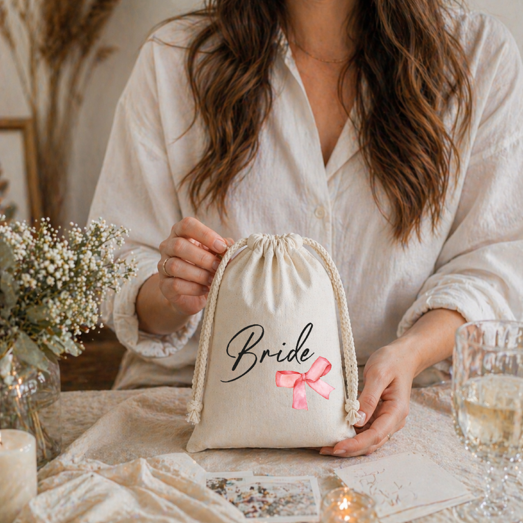 Bavlněný pytlík s elegantním potiskem „BRIDE“ je perfektní volbou pro nevěstu. Ať už na svatební den, předsvatební přípravy nebo rozlučku se svobodou. Skvěle poslouží na uložení kosmetiky, šperků či jiných nezbytností, které chce mít nevěsta vždy po ruce.