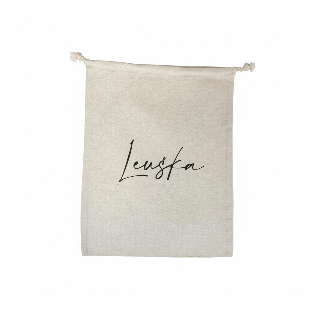 Bavlněný pytlík o rozměru 26 x 35 cm s potiskem jména Leuška čeká na svého nového majitele.