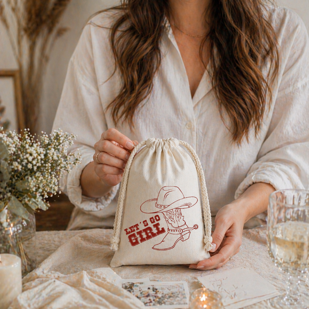 Bavlněný pytlík s potiskem „LET'S GO GIRL“ je perfektní volbou pro nevěstu. Ať už na svatební den, předsvatební přípravy nebo rozlučku se svobodou. Skvěle poslouží na uložení kosmetiky, šperků či jiných nezbytností, které chce mít nevěsta vždy po ruce.