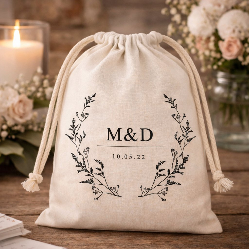 Bavlněný pytlík s vlastními iniciálami a datem svatby KVĚTINY