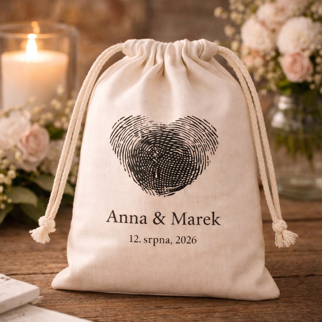 Bavlněný pytlík s vlastními jmény a datem svatby OTISKY