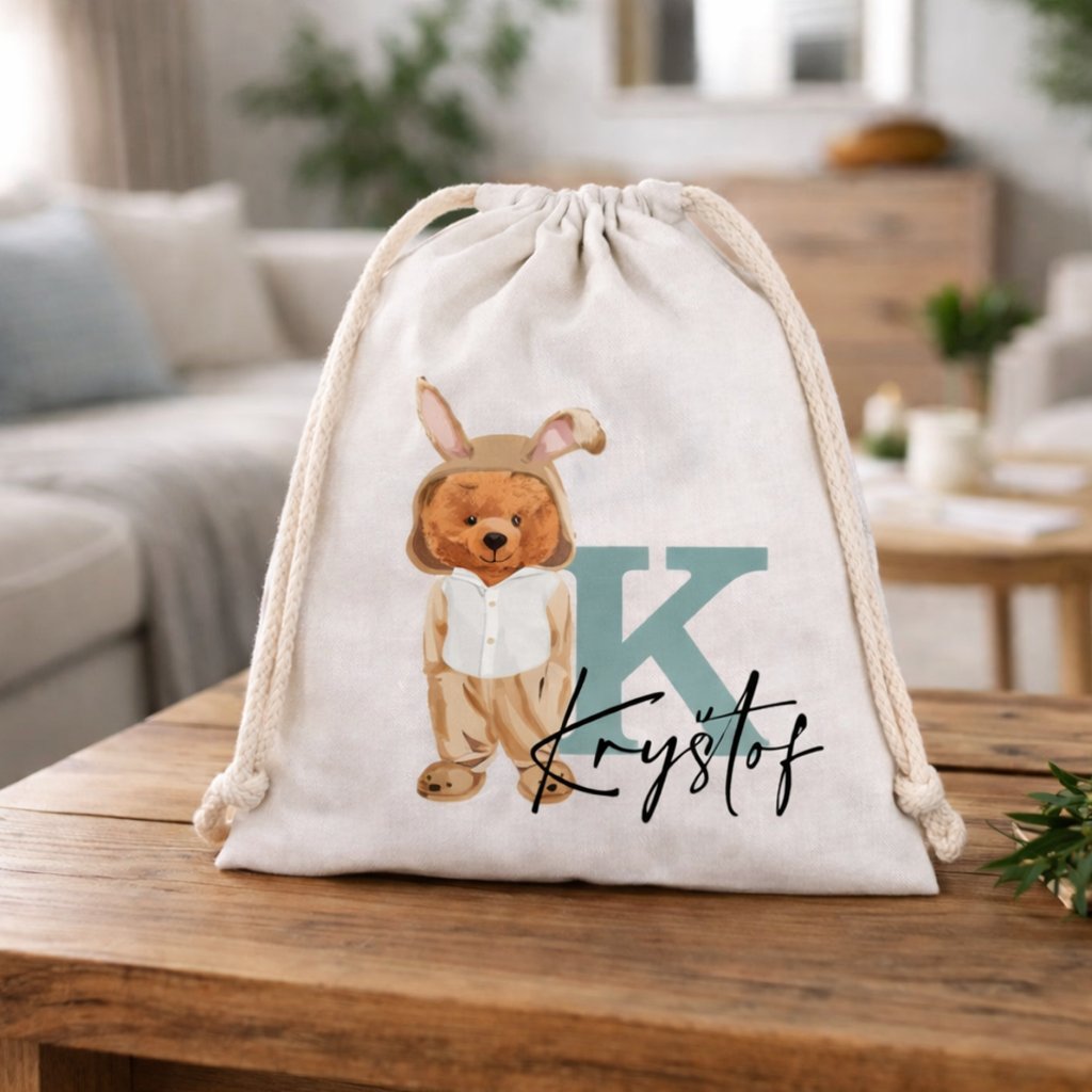 Bavlněný pytlík s jarním motivem MEDVÍDKA v převleku za zajíce s vlastním jménem, který je ideální jako pytlíček do školy či školky na pyžámko, bačkůrky, náhradní oblečení, tělocvik, nebo když si děti potřebují přibalit pár drobností k babičce.