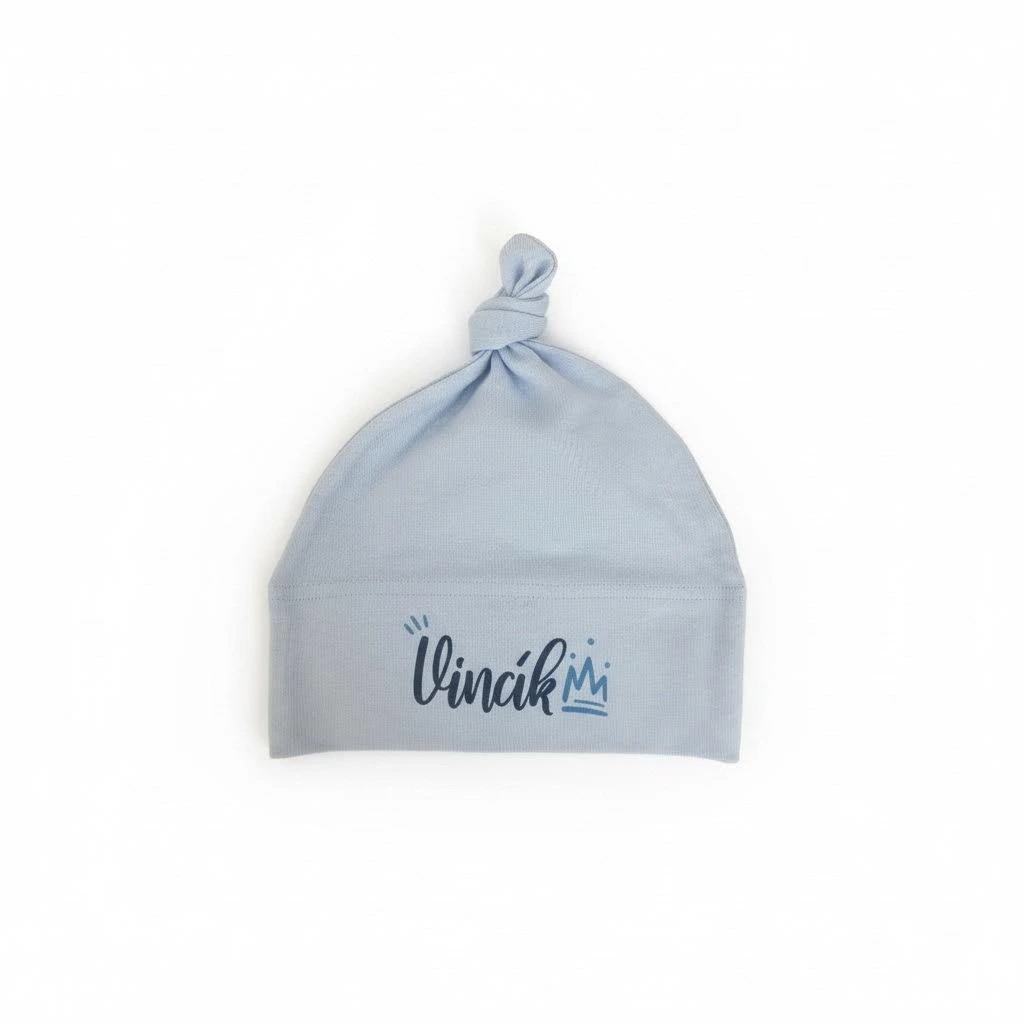 Modrá čepička s uzlíkem a potiskem jména Vincík se už těší na svého nového majitele!
