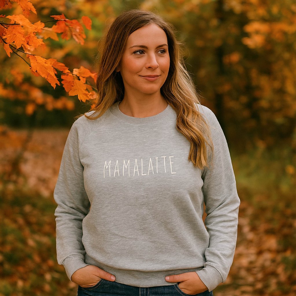 Dámská mikina s vyšitím MAMALATTE. Mikina je z hladkého úpletu a skvěle drží svůj tvar, díky pružné gumě kolem pasu a širokým lemům na rukávech.
