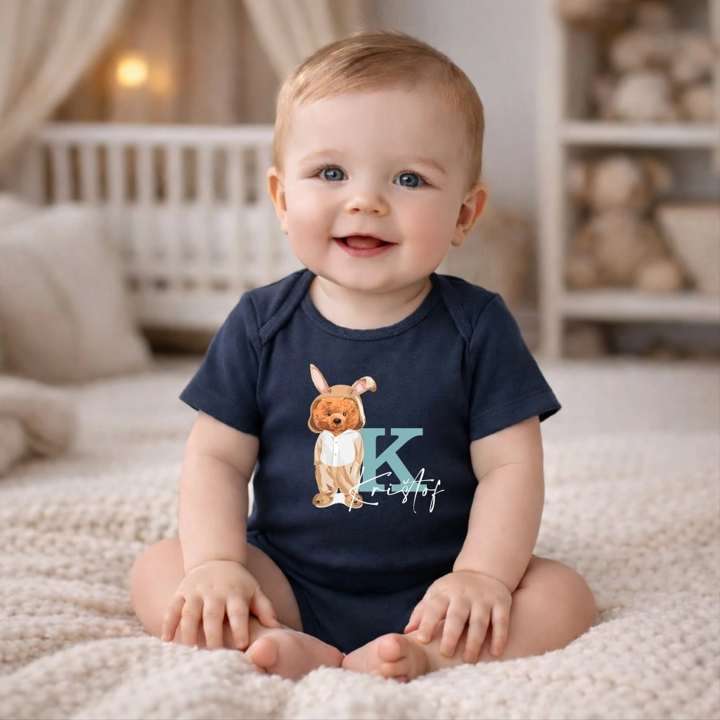 Vtipné dětské bodýčko s potiskem MEDVÍDKA v převleku za zajíce. Tričko zdobí nápis vlastního jména dítěte.