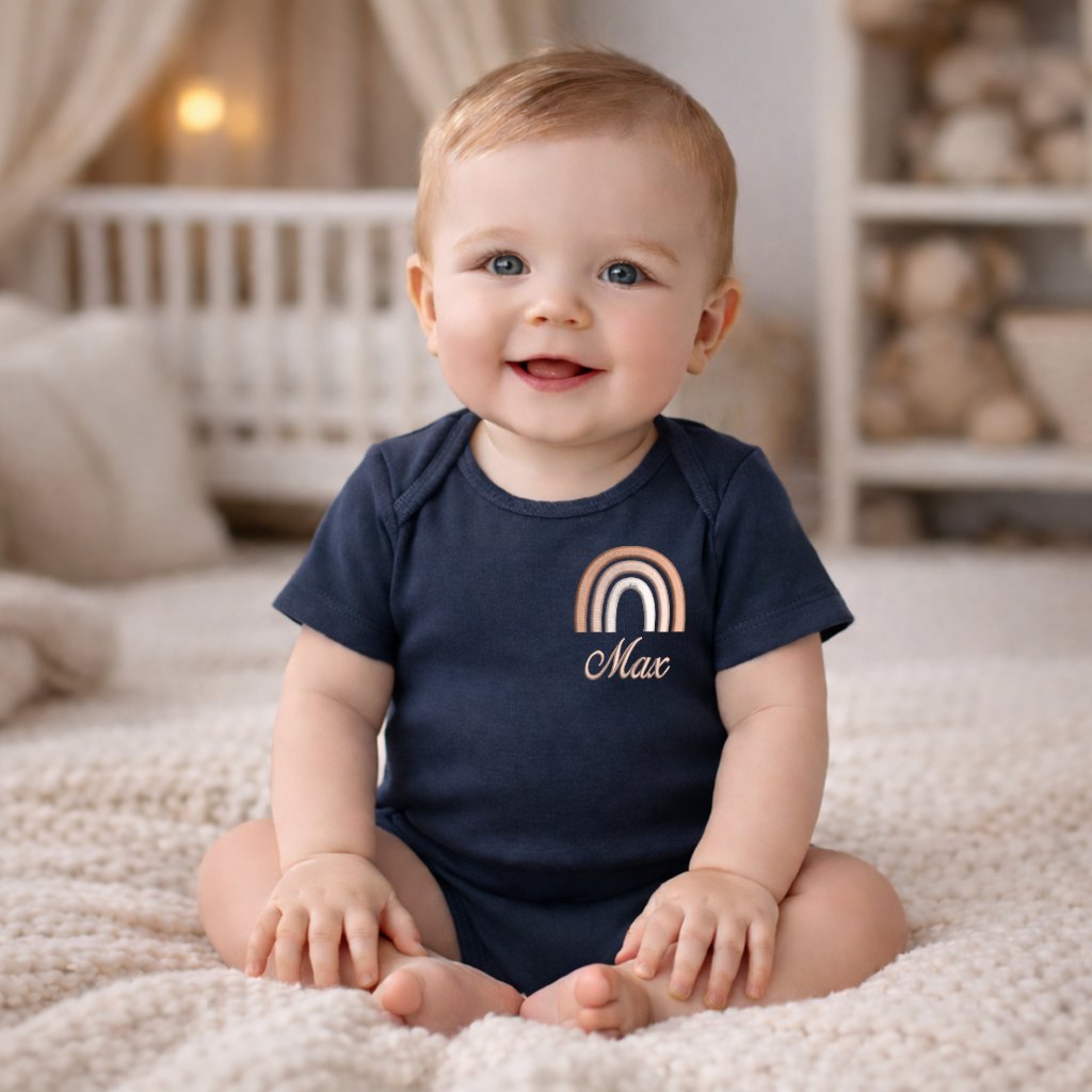 Na levé straně je výšivka duhy/medvídka se jménem Vašeho dítěte.