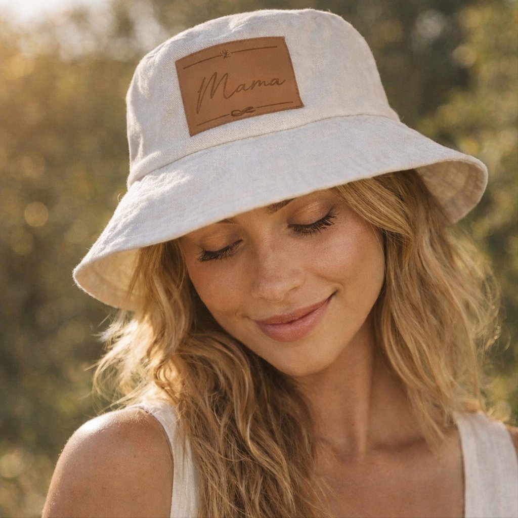 Dospělý klobouček s karamelovou koženkou na které je vygravírované mama spolu s ležatou osmičkou.
