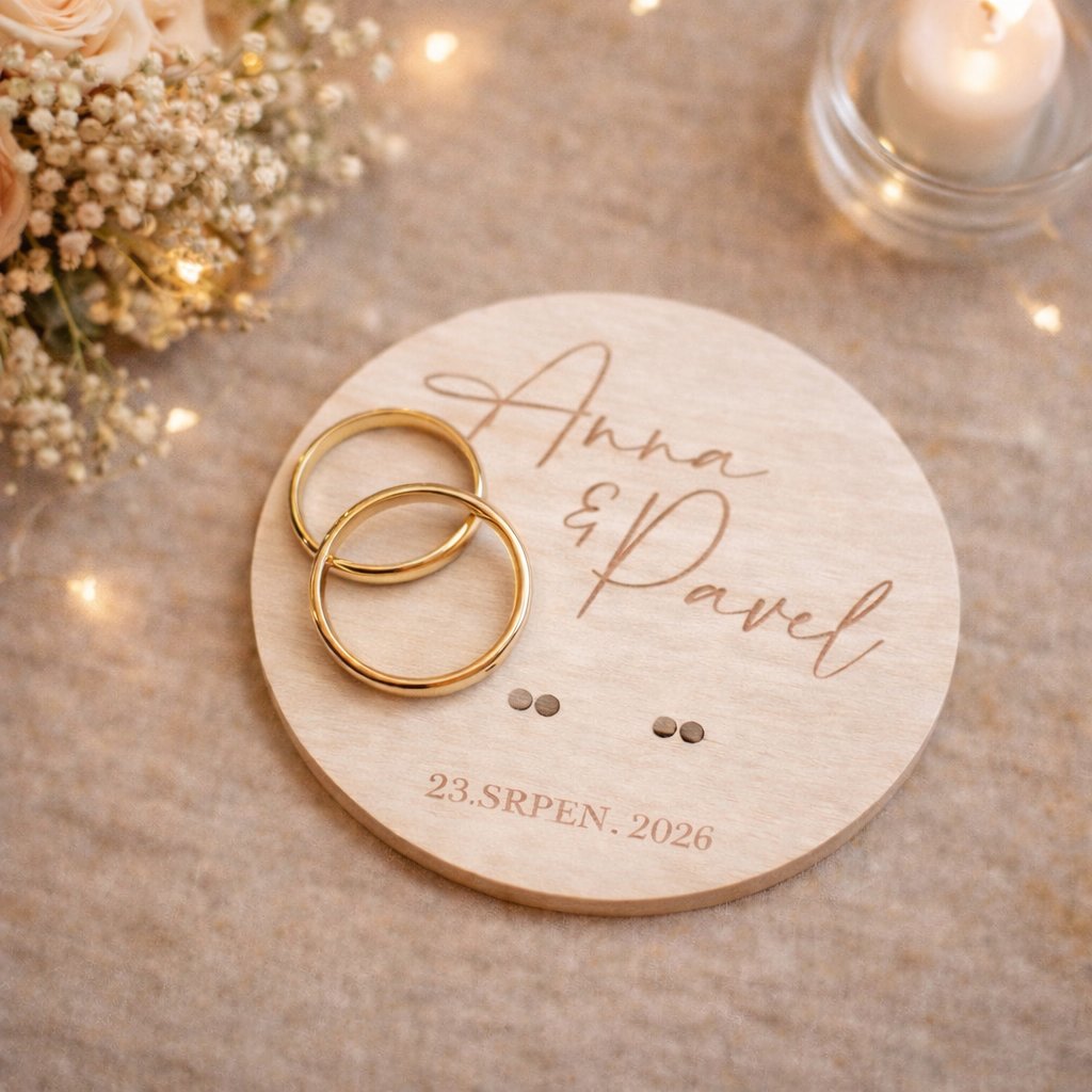 Dřevěná destička na prstýnky s gravírováním Vašich jmen a data svatby je skvělý způsob, jak u oltáře předat snubní prstýnky.