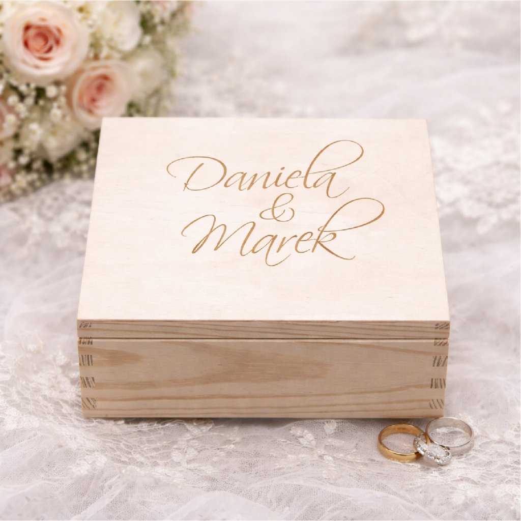 Objevte kouzlo personalizované dřevěné krabičky s gravírováním Vašich jmen, která se stane nezapomenutelným doplňkem Vašeho svatebního dne. Tato elegantní krabička je ideální pro uložení snubních prstýnků a jejich předání u oltáře. Díky možnosti gravírování jmen získáte jedinečný a osobní kousek, který bude připomínat Váš výjimečný den po mnoho let.