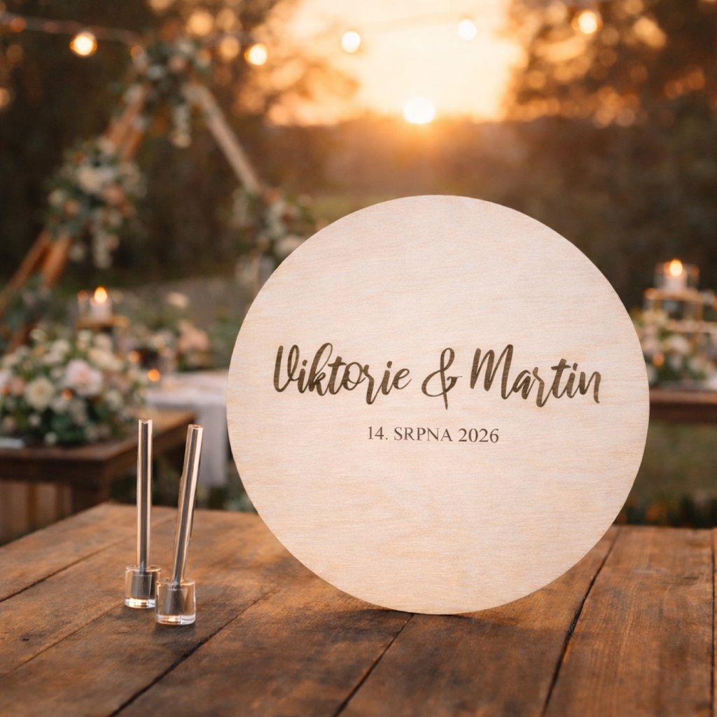 Dřevěná cedule na podpisy s gravírováním jmen a data svatby KRUH