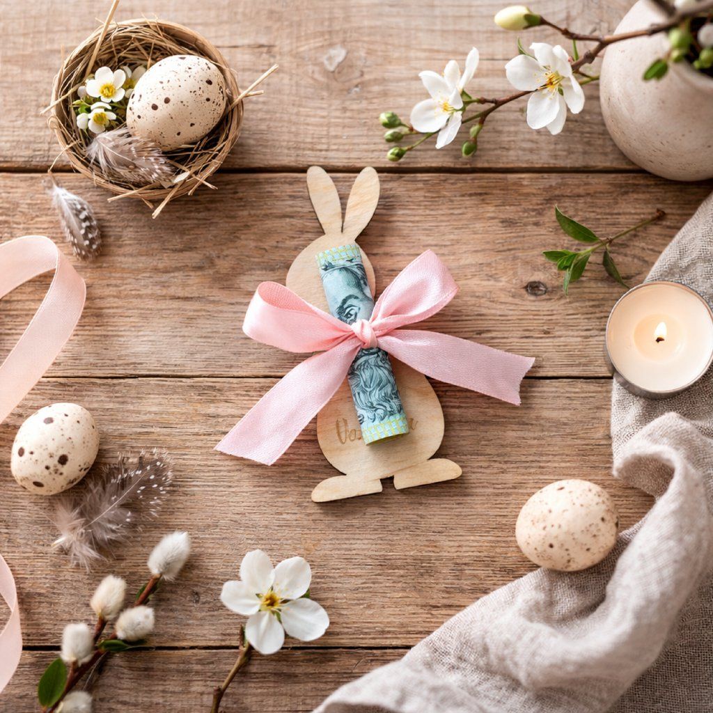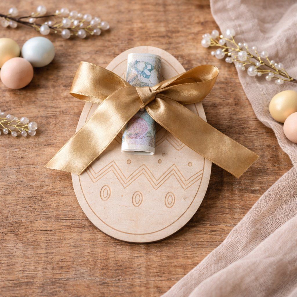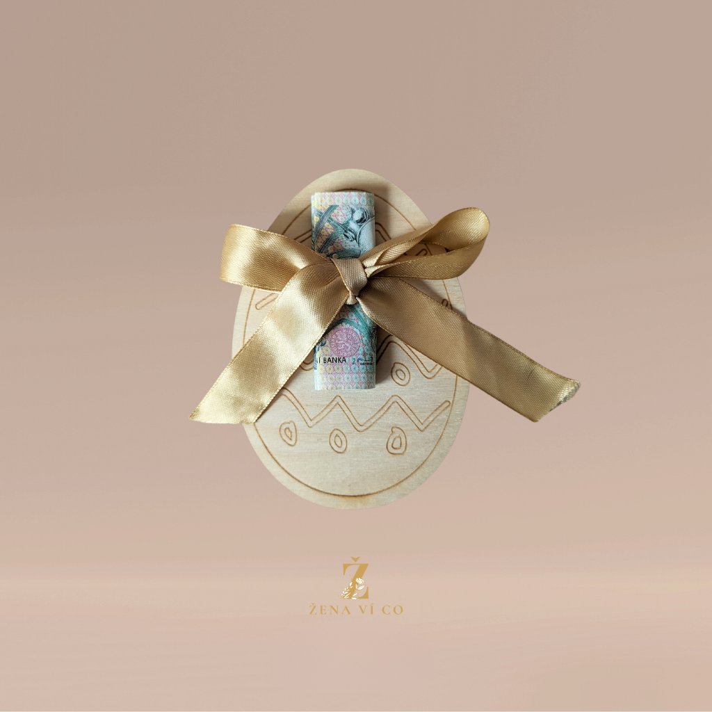 Dřevěná velikonoční dekorace na peníze je skvělý způsob, jak si vkusně a originálně přichystat výslužku pro větší koledníky.