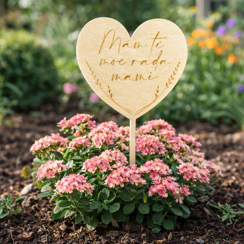 Tato krásná dřevěná zapichovací ozdoba je skvělým dárkem pro každou maminku! Ozdoba s gravírováním "MÁM TĚ MOC RÁDA, MAMI" je ideální pro umístění do květináčů, květinových boxů nebo dortů.