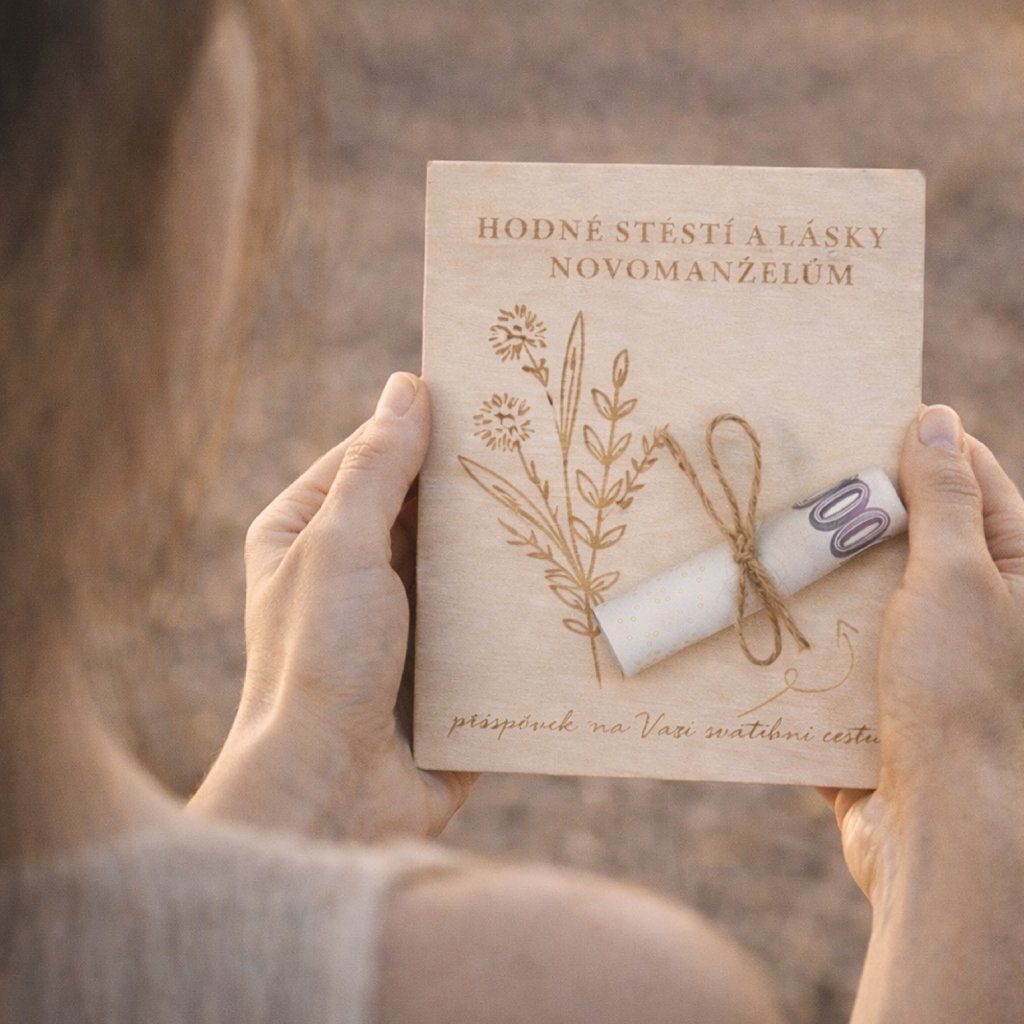 Originální dřevěné dárkové přání novomanželům s gravírovaným, je skvělý způsob, jak darovat peníze více osobně.