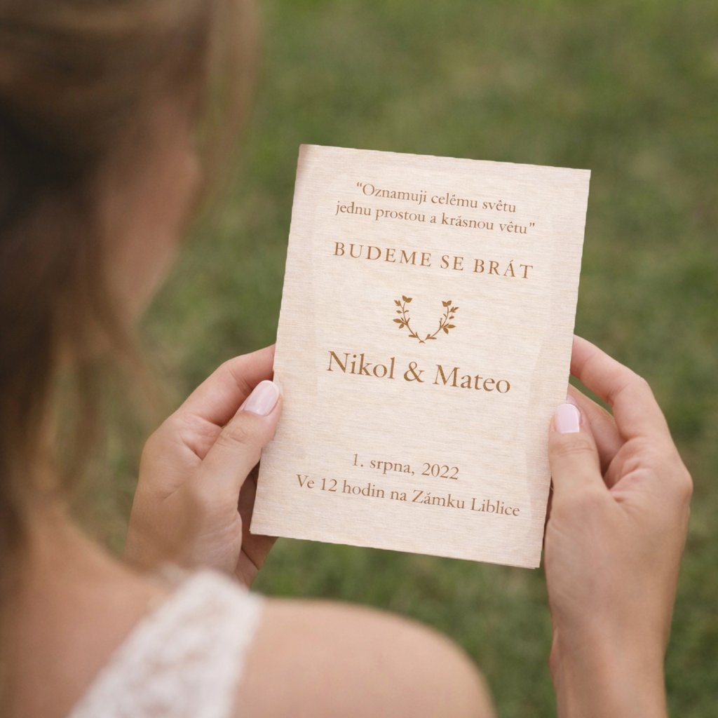 Dřevěné svatební oznámení s gravírováním. Krásné přírodní svatební oznámení, kterým Vašim budoucím svatebním hostům sdělíte všechny důležité informace a taky si budou moci oznámení uschovat, jako památku na Váš velký den.