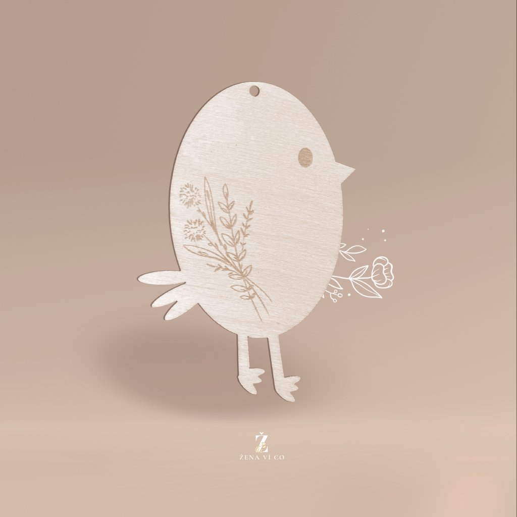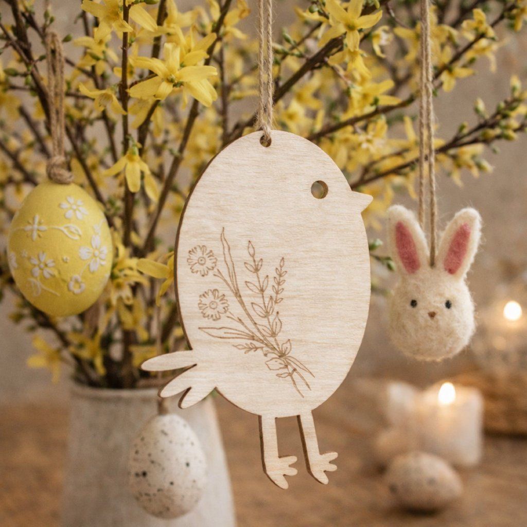 Dřevěné Velikonoční kuřátko na zavěšení, které můžete doplnit ke své Velikonoční výzdobě nebo třeba zavěsit na dveře čí květinu.