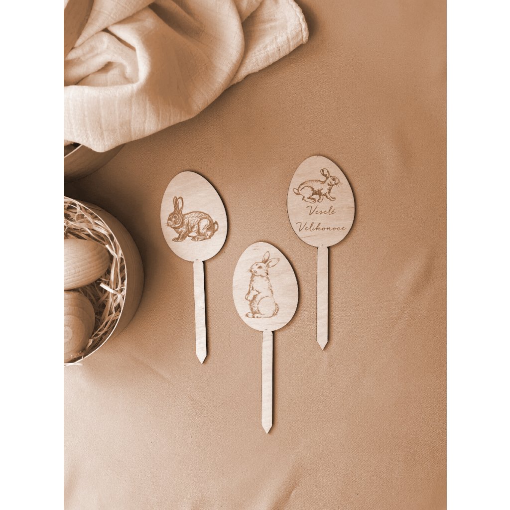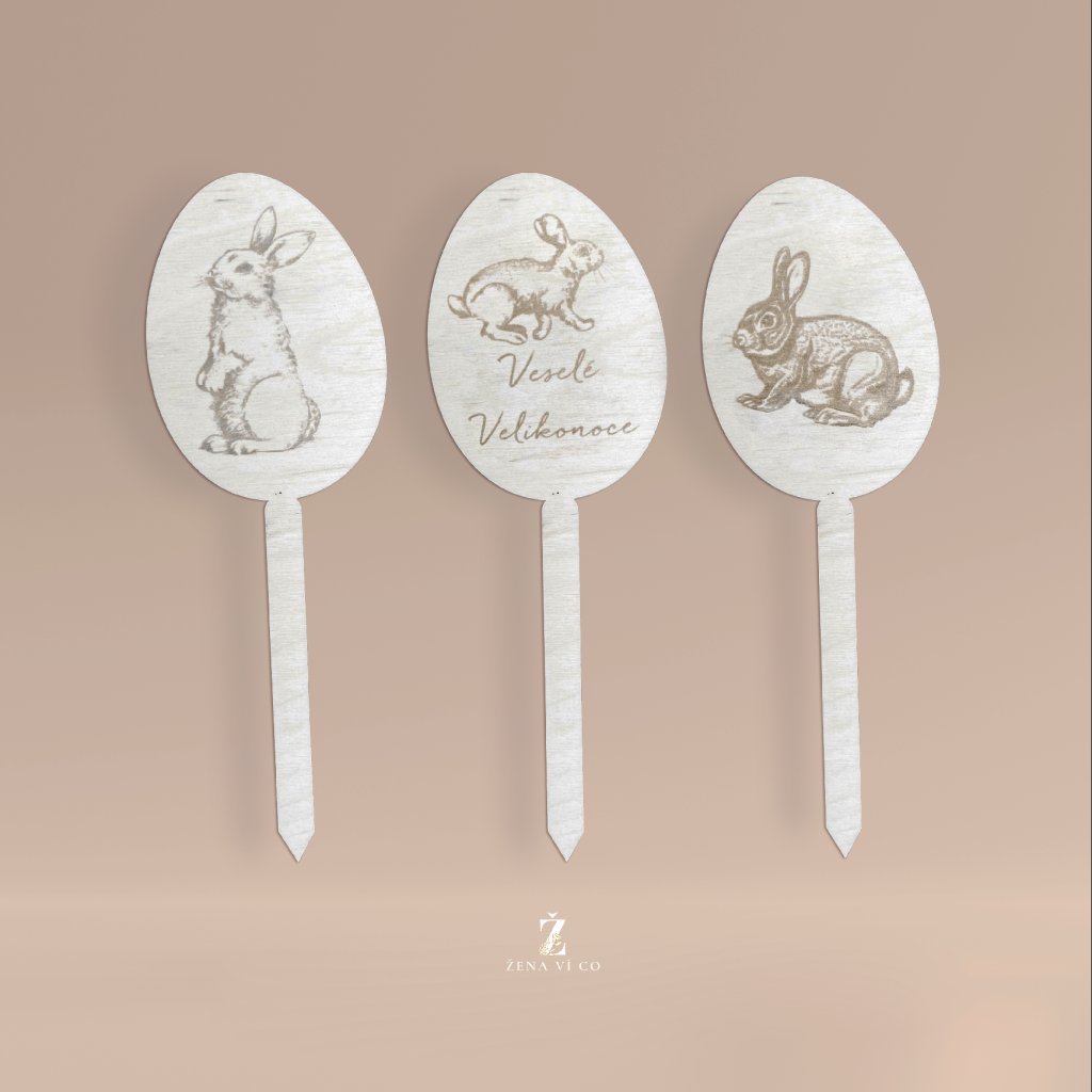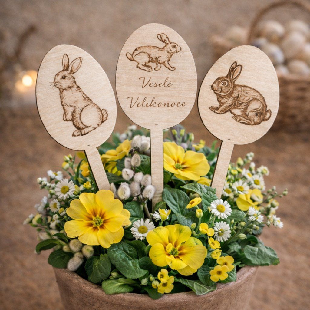Dřevěné zapichovací ozdoby, které můžete doplnit ke své Velikonoční výzdobě a ozdobit si tak například květináč.
