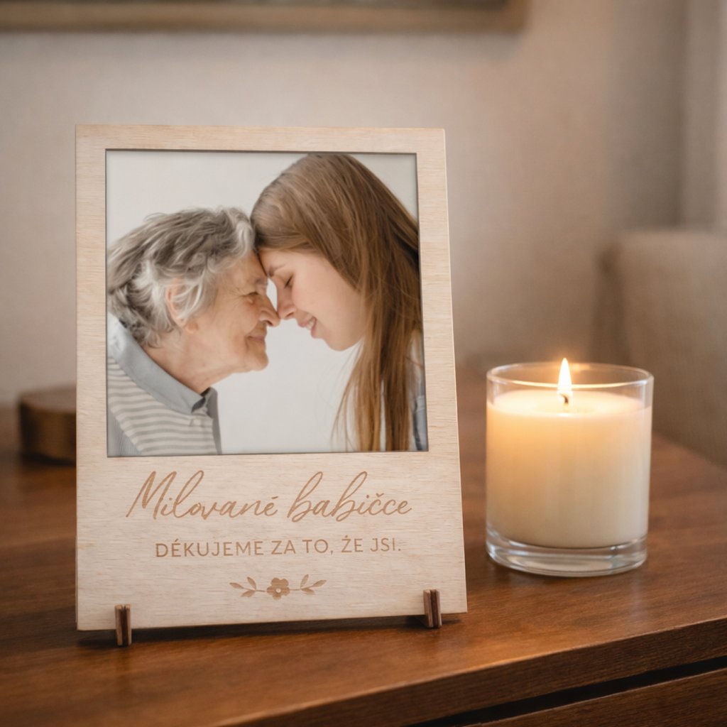 Originální dárek babičce. Dřevěný rámeček na fotografie který vykouzlí úsměv na tváři každé babičce a zároveň poslouží jako krásná dekorace. Součástí rámečku jsou stojánky, nálepky a magnetek na uchycení fotografie.