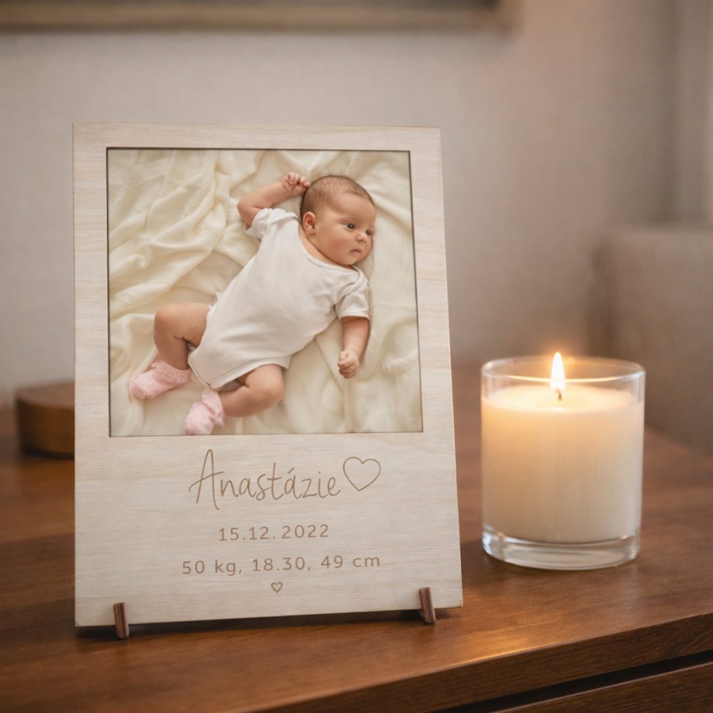 Dřevěný rámeček se jménem a údaji o novorozenci