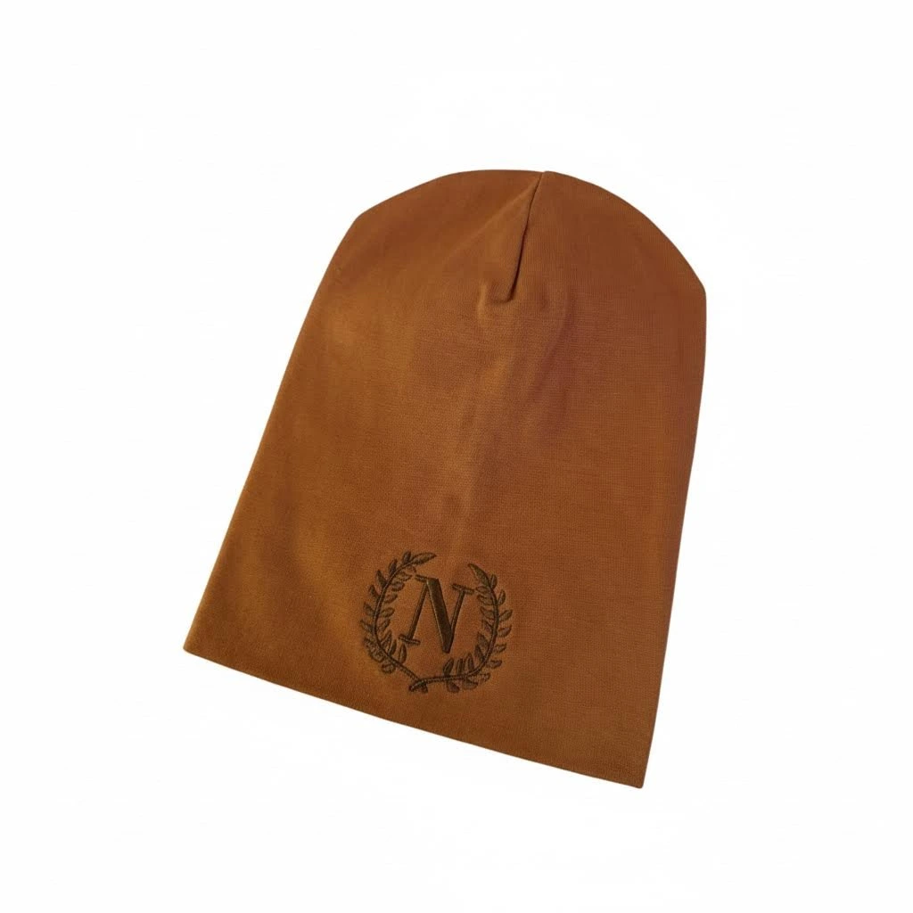 Hnědá jarní čepička s výšivkou N, ve velikosti 5 měsíců - 3 roky se už těší na svého nového majitele!