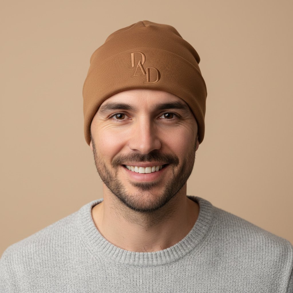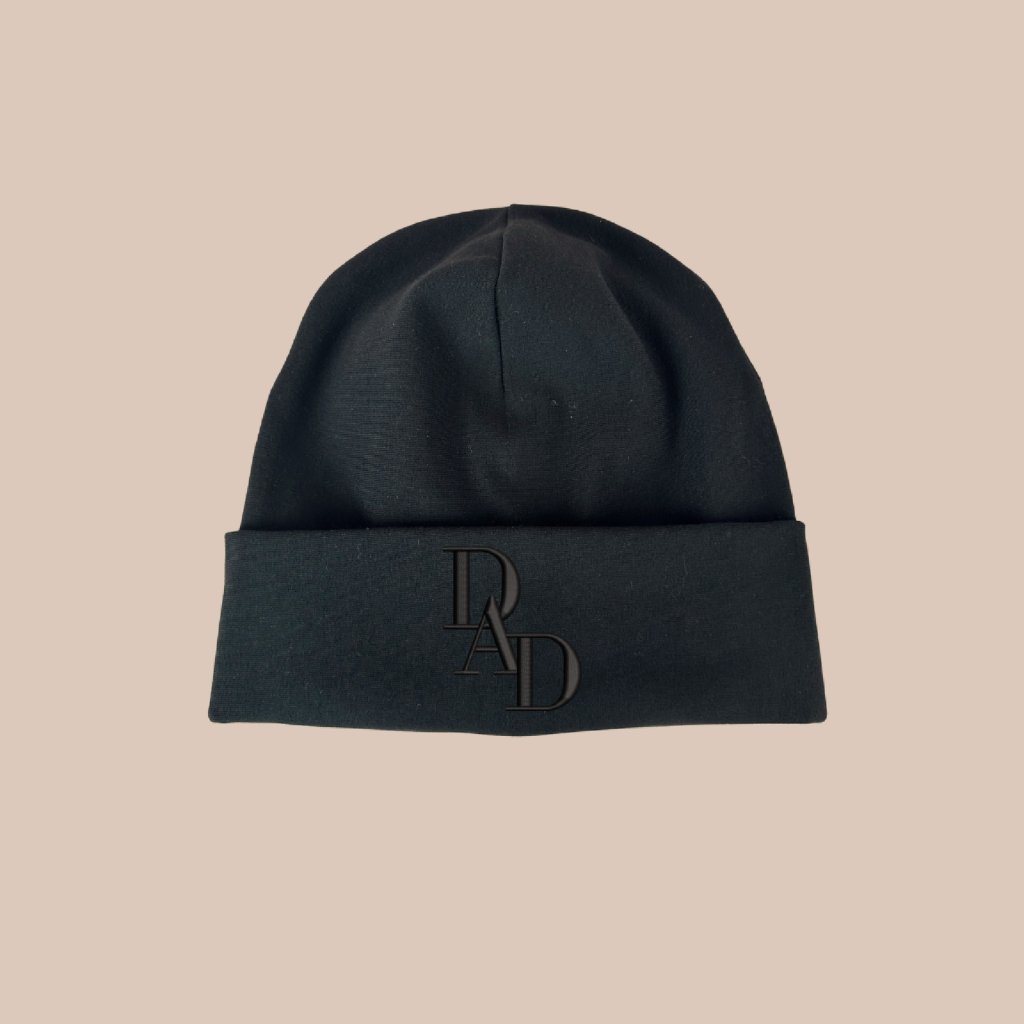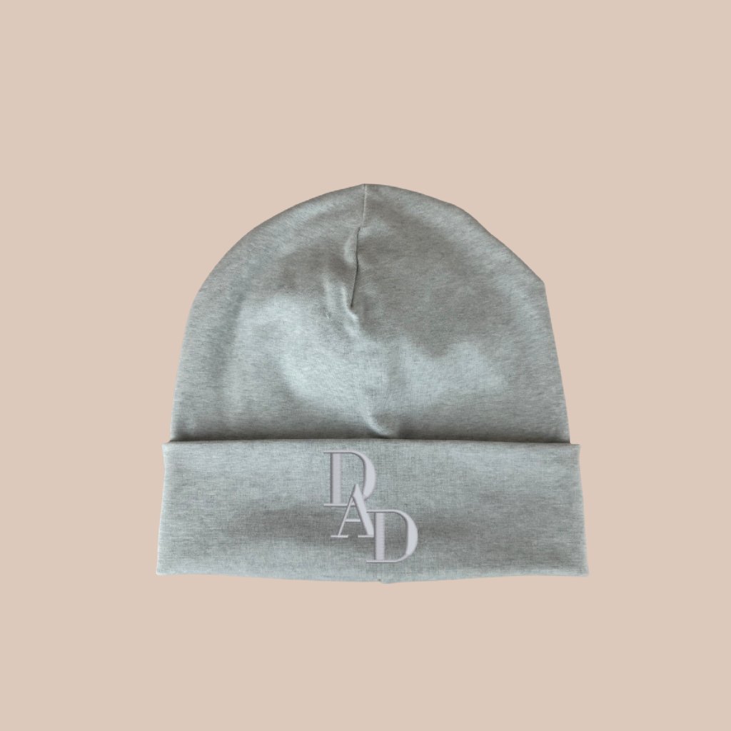 Jarní čepička s vyšitím DAD. Detail čepičky je vyšitý nití, která je tón v tónu s barvou látky čepičky.
