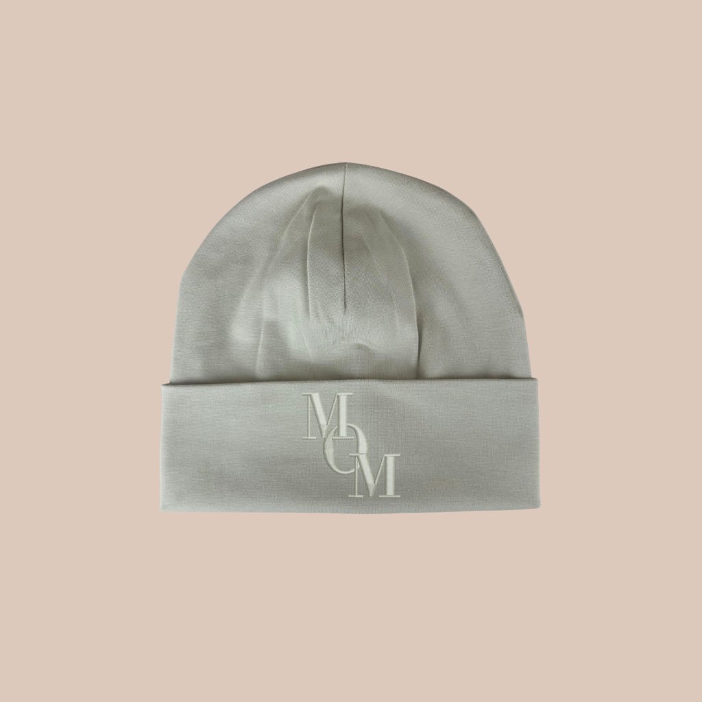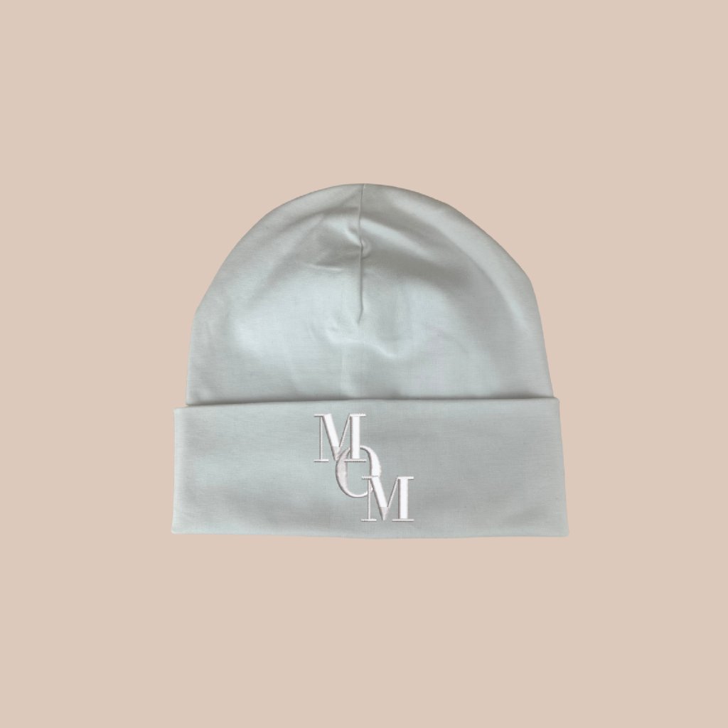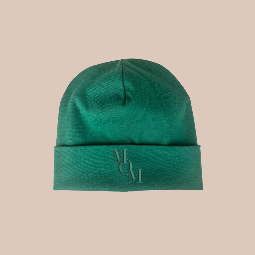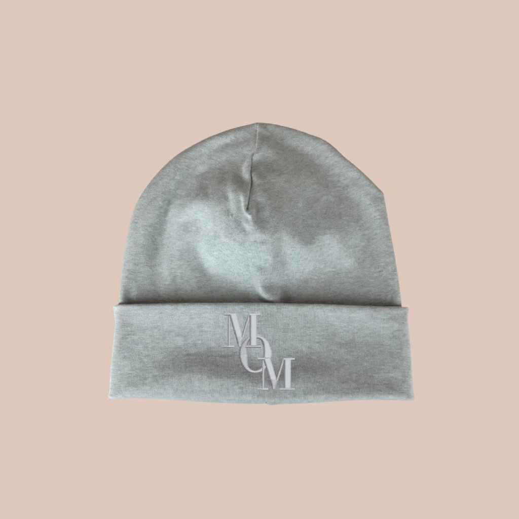 Jarní čepička s vyšitím MOM. Detail čepičky je vyšitý nití, která je tón v tónu s barvou látky čepičky.