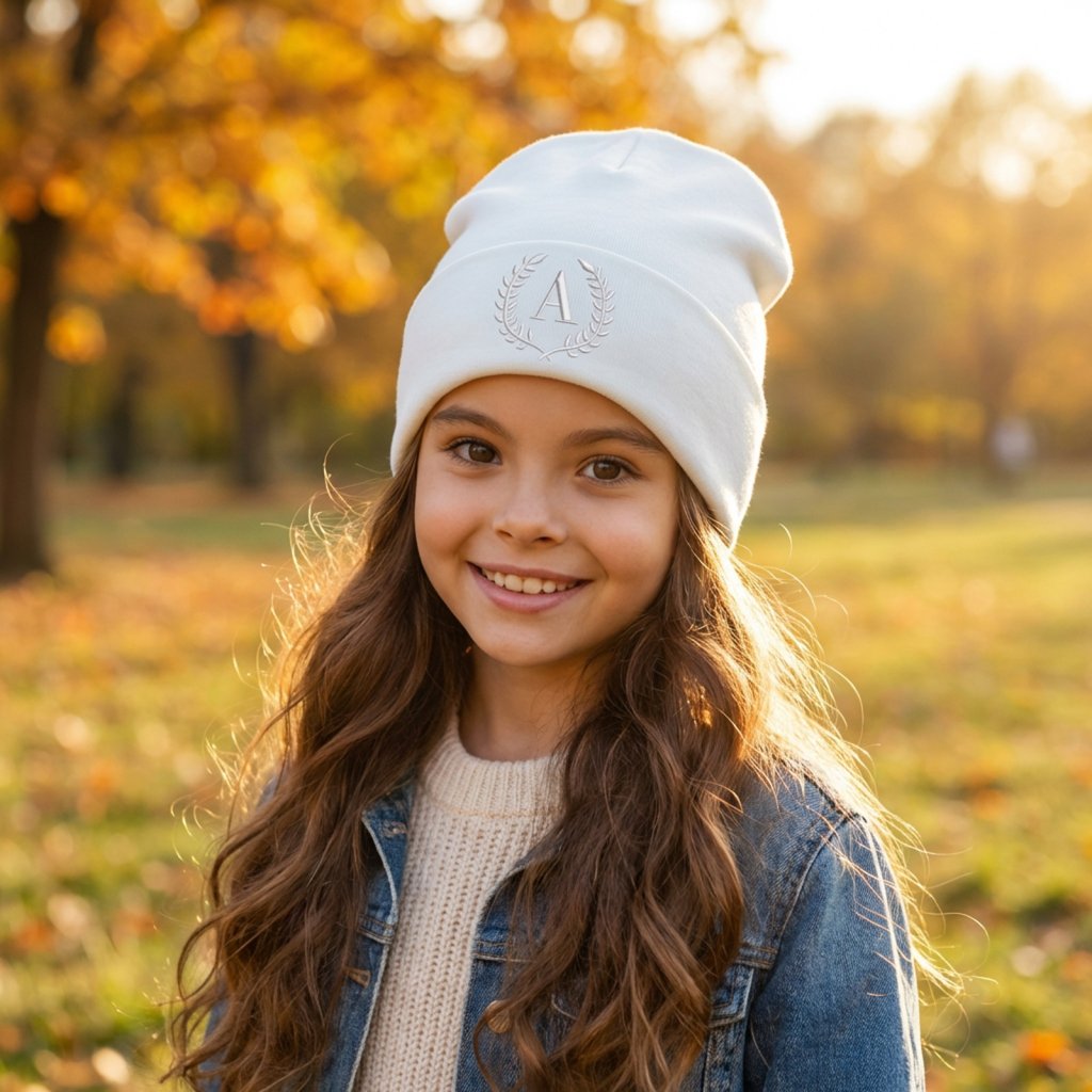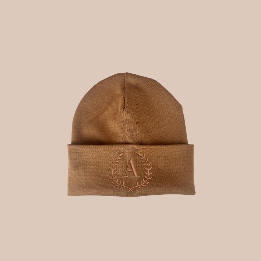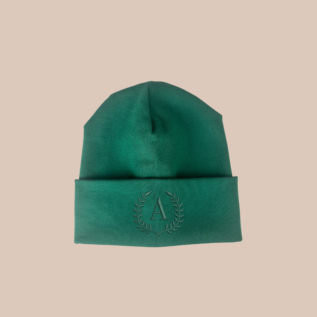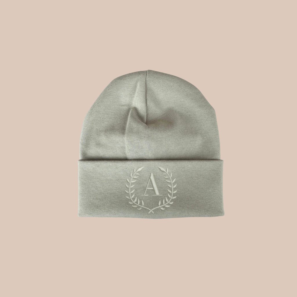 Jarní čepička s vyšitím vlastního monogramu. Čepička je z hladkého úpletu, je pružná a poddajná. Krásně sedí na hlavičce. Detail čepičky, zdobí monogram který je vyšitý nití, která je tón v tónu s barvou látky čepičky.