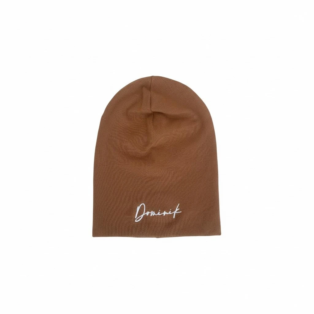 Hnědá jarní čepička s výšivkou Dominik, ve velikosti 5 měsíců - 3 roky se už těší na svého nového majitele!