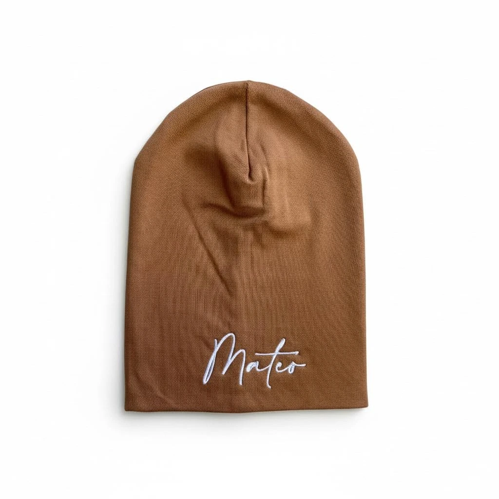 Hnědá jarní čepička s výšivkou Mateo, ve velikosti 5 měsíců - 3 roky se už těší na svého nového majitele!