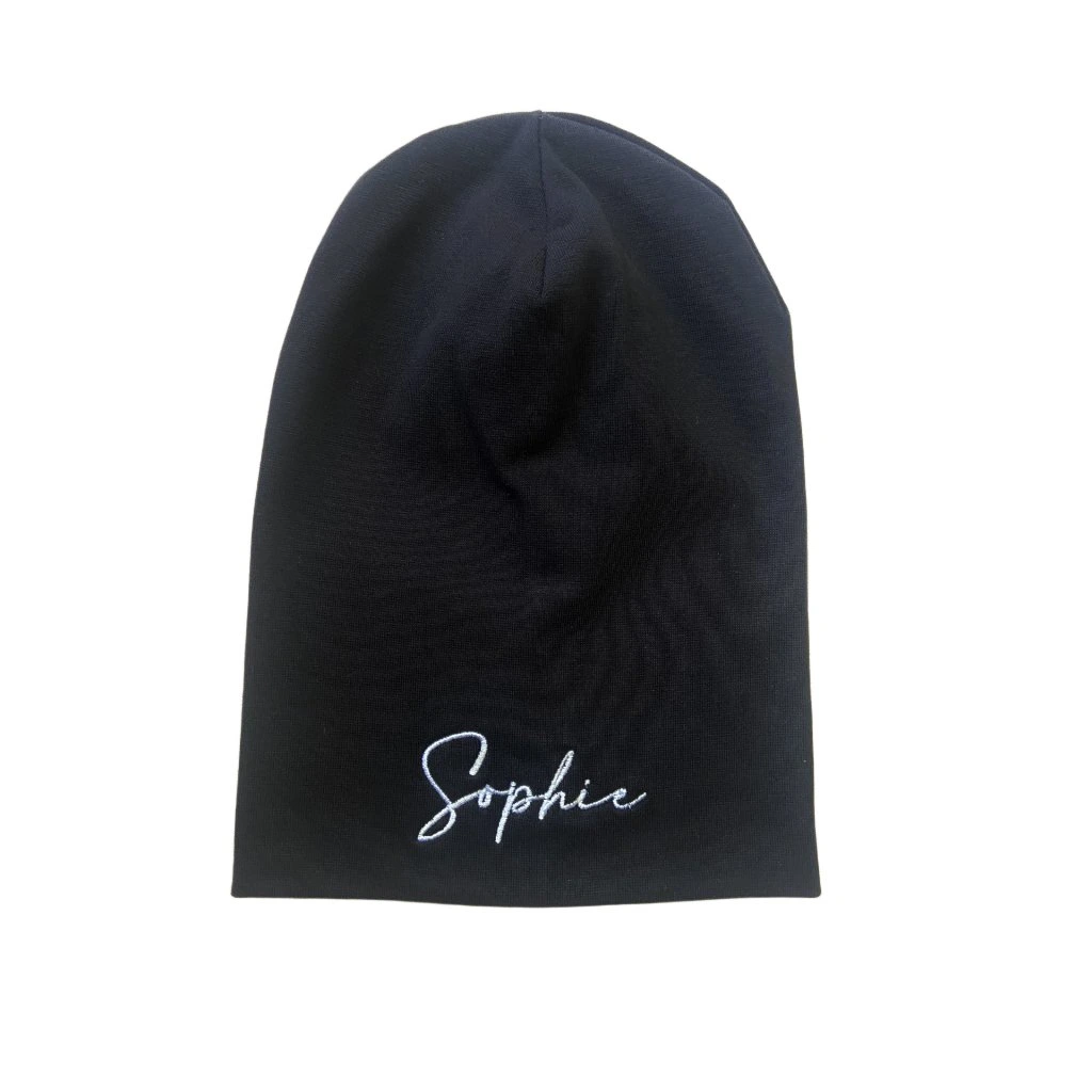 Černá jarní čepička s výšivkou Sophie, ve velikosti 5 měsíců - 3 roky se už těší na svého nového majitele!