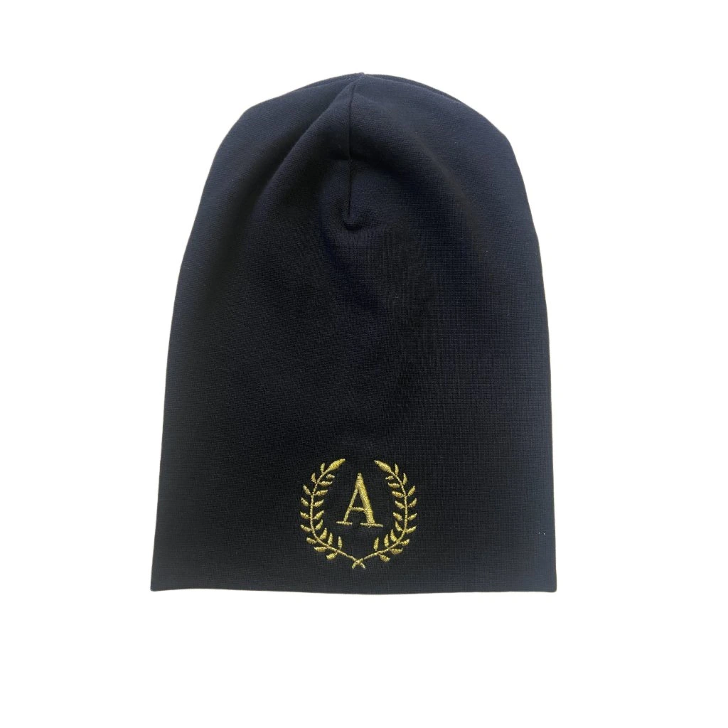 Černá jarní čepička s výšivkou A, ve velikosti 5 měsíců - 3 roky se už těší na svého nového majitele!