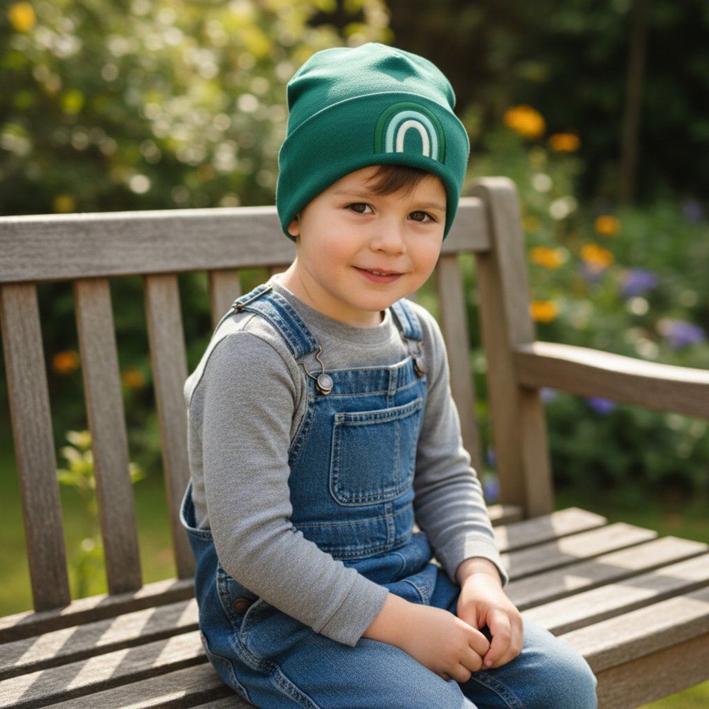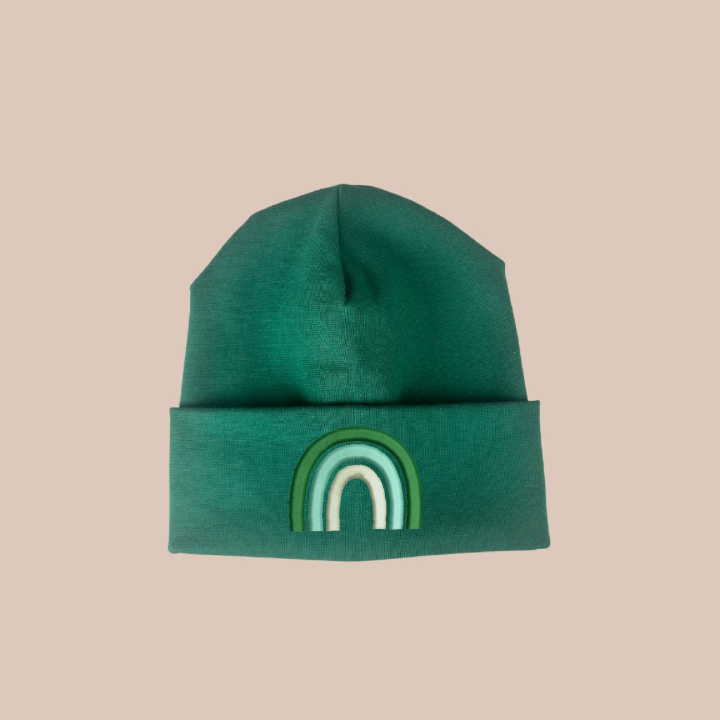Jarní čepička s výšivkou duhy v pastelových barvách