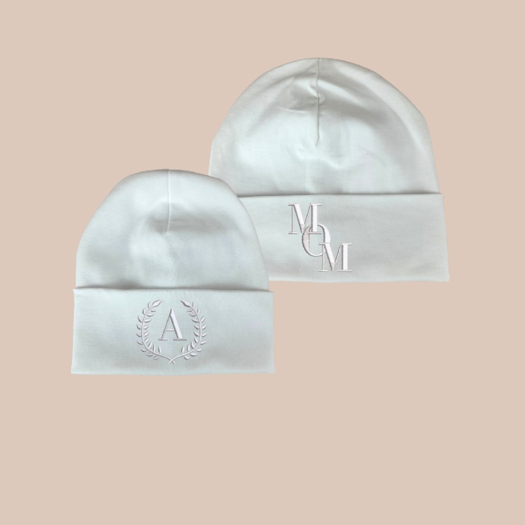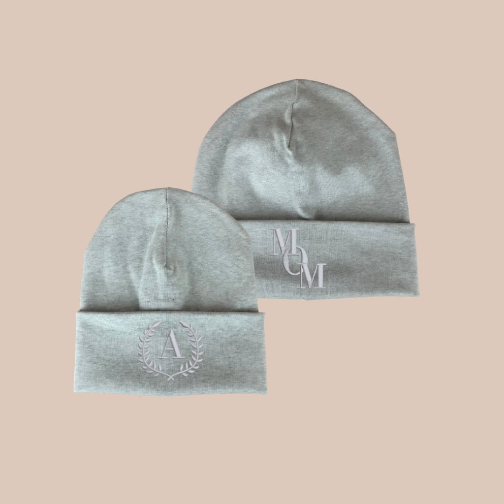 Jarní čepičky z hladkého upletu v té nejvyšší kvalitě s vyšitím. Detail čepičky, je vyšitý nití, která je tón v tónu s barvou látky čepičky.