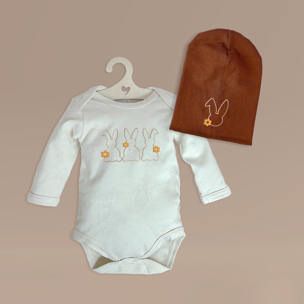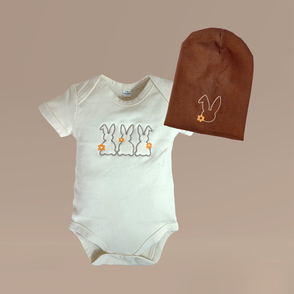- Body s výšivkou ZAJÍČCI, s dlouhým, nebo krátkým rukávem, v béžové barvě.