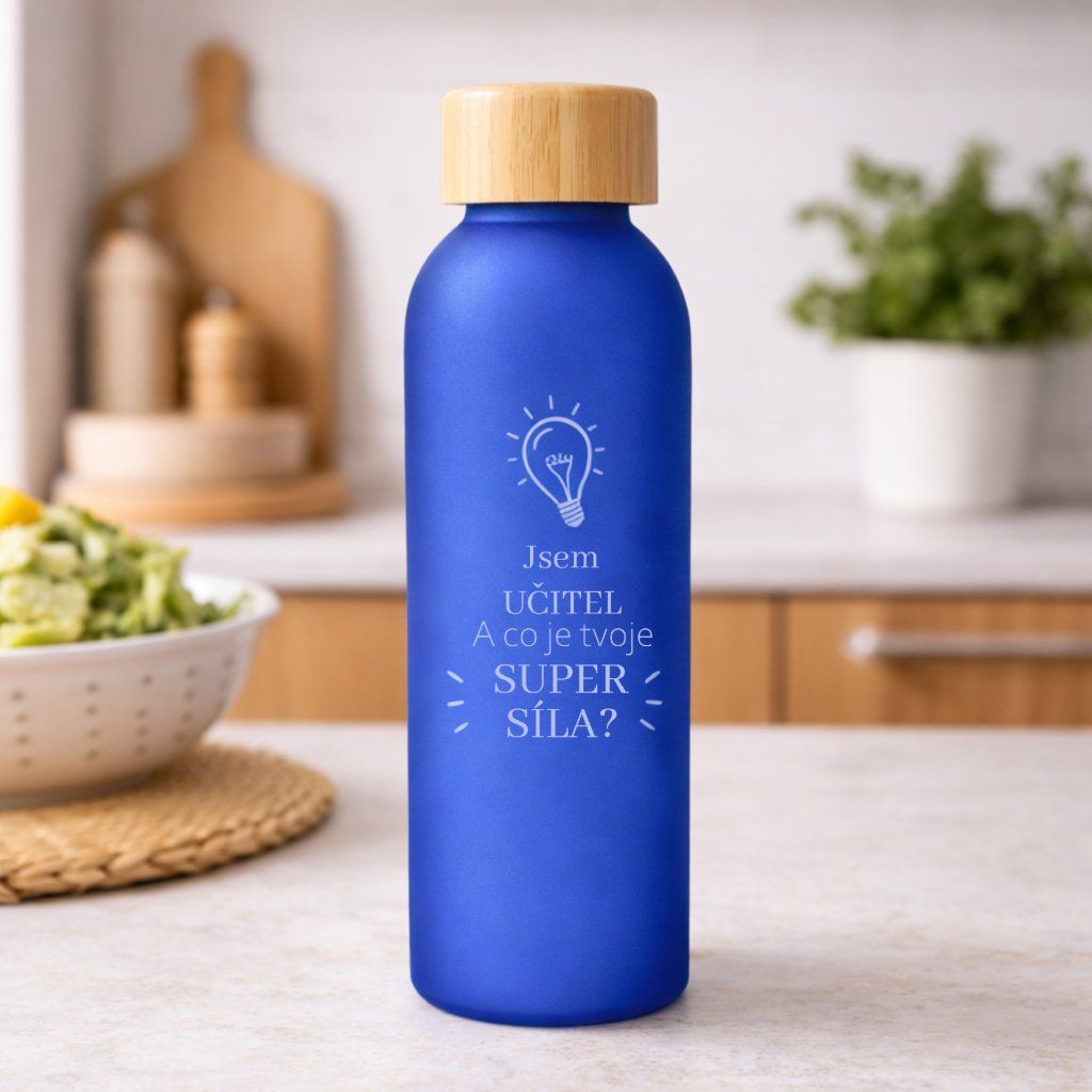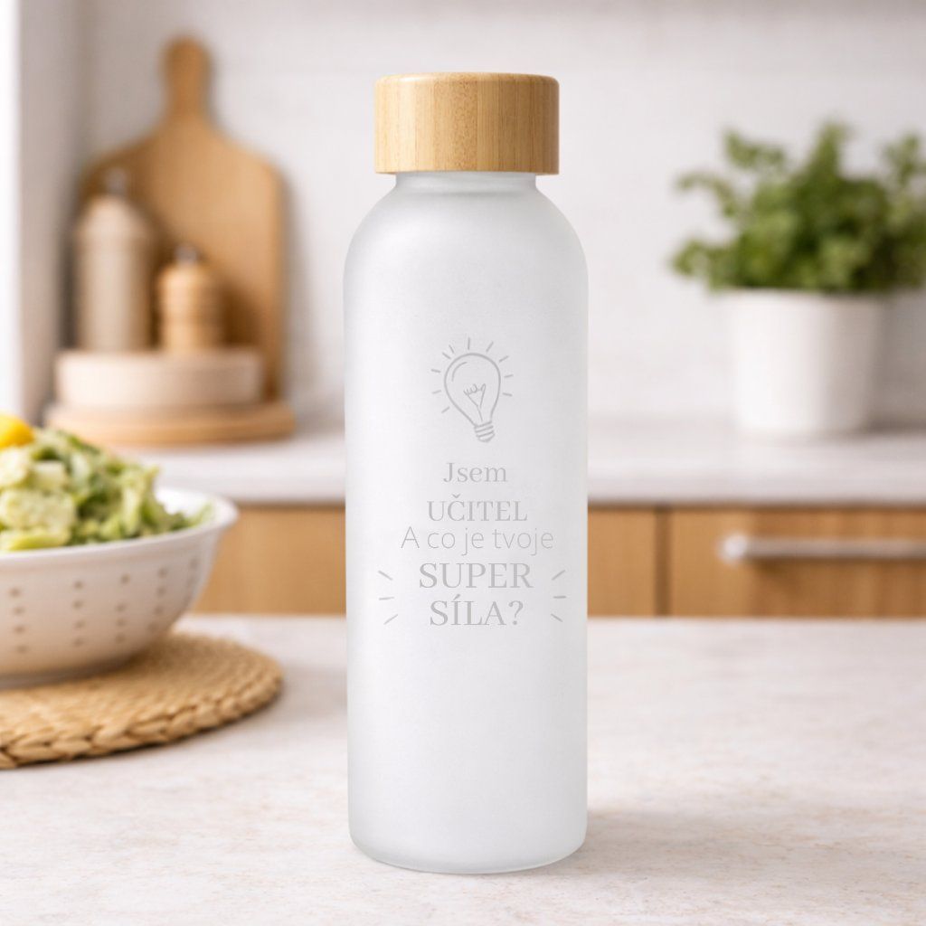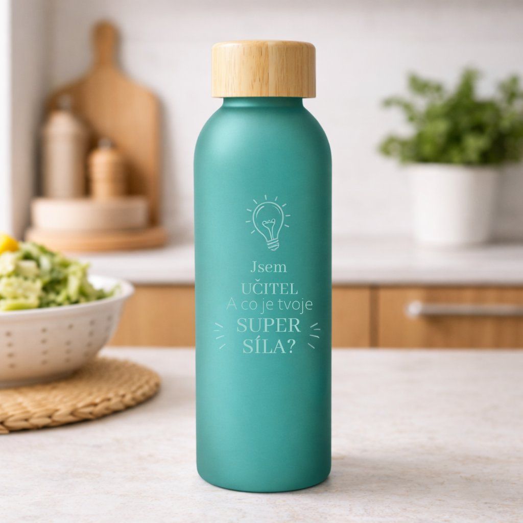 Skleněná láhev na vodu s matným povrchem a gravírovanými motivem zaručeně potěší pana učitele. Je ideálním doplňkem na cesty do auta, do školy, na výlet. Pokud zároveň dbáte na ekologii a zdravý životní styl, pak je tato skleněná láhev s bambusovým víčkem tou správnou volbou.