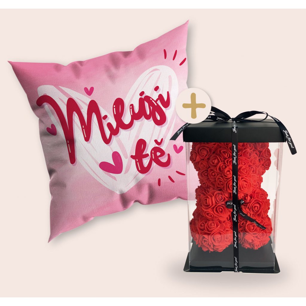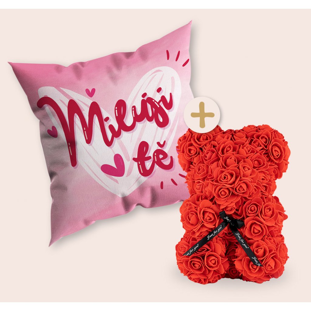 Medvídek z růží + Polštář MILUJI TĚ