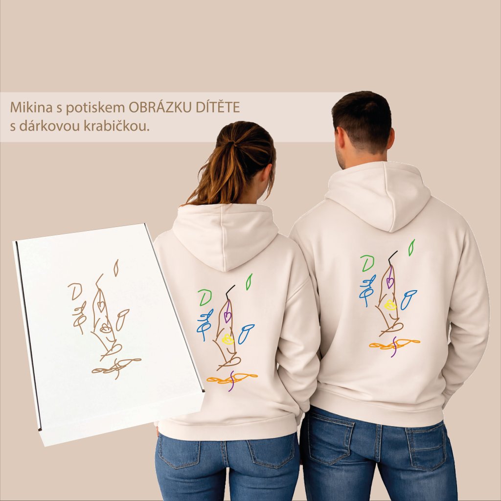 Uchovejte si vzpomínku na první umělecké dílo Vašeho dítěte s naší unikátní mikinou, která nese potisk jeho obrázku. Nabízíme Vám možnost vytvořit kopii dětského obrázku a potiskneme ji na mikinu v barvách originálu. U finálně potisknutého obrázku mohou vzniknout jemné odlišnosti, obrázky a fotografie pro Vás překreslujeme vždy ručně.