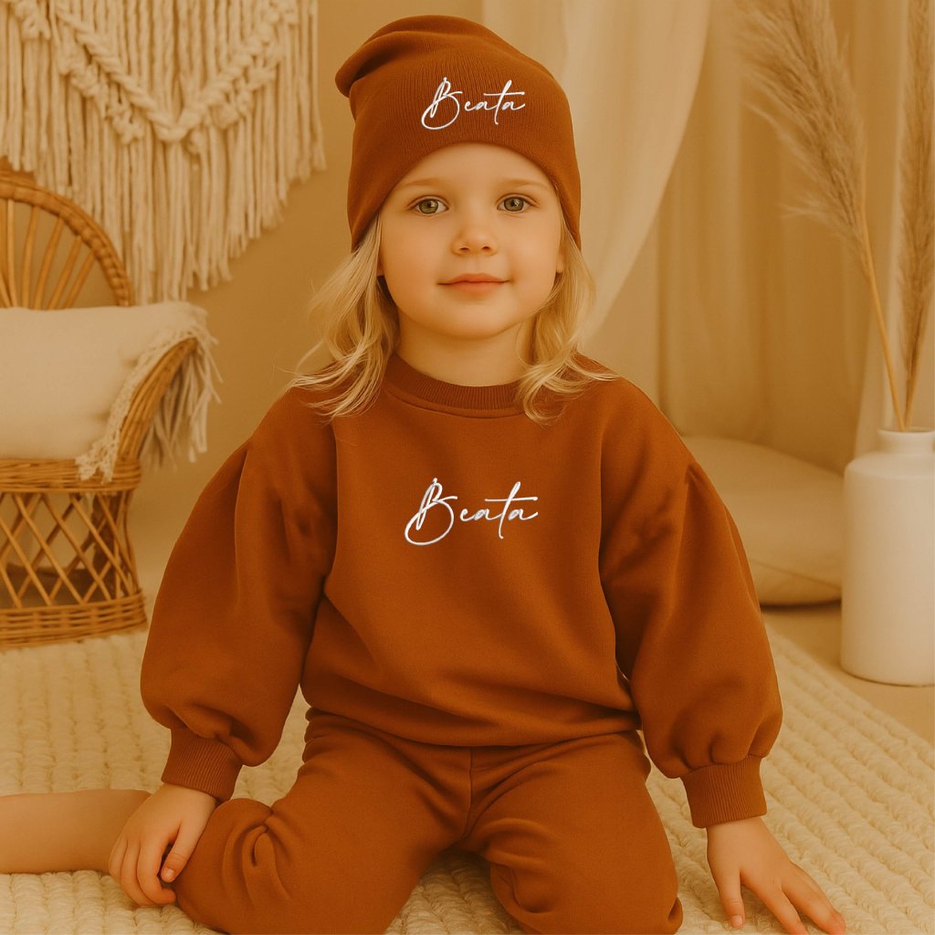Dětská mikina s výšivkou jména. Mikina s balónovými rukávy, které obohatí vzhled celé mikiny, na rukávech má pružnou gumu aby držela svůj skvělý tvar. Detail mikiny a čepičky tvoří stylová výšivka jména Vašeho děťátka.
