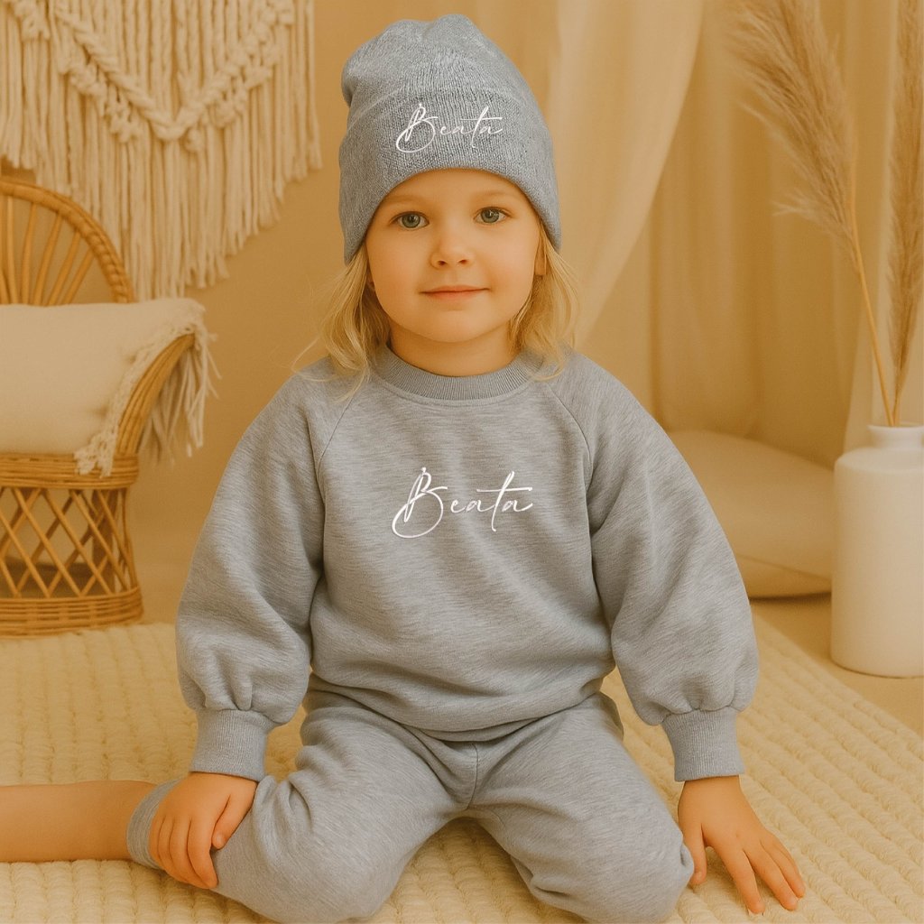 Dětská mikina s výšivkou vlastního jména. Mikina s balónovými rukávy, které obohatí vzhled celé mikiny, na rukávech má pružnou gumu aby držela svůj skvělý tvar. Detail mikiny a čepičky tvoří stylová výšivka jména Vašeho děťátka.
