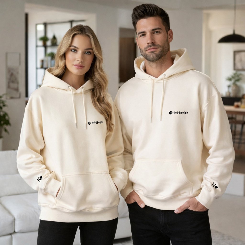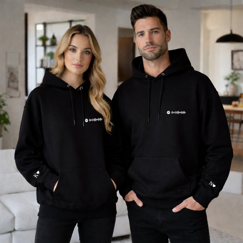 Objevte naši stylovou mikinu s potiskem monogramu a písně ukryté v QR kódu Spotify, ideální pro páry, které chtějí přidat osobní dotek do svého šatníku. Tyto mikiny jsou vyrobeny z organické bavlny a jsou dostupné ve dvou elegantních barvách – černé a béžové. Naše mikiny jsou navrženy tak, aby Vám poskytly maximální pohodlí a styl. Uveďte do poznámky při objednávce monogram a název písně. Přidejte do svého šatníku kousek originality a elegance s naší mikinou s potiskem monogramů a písně!