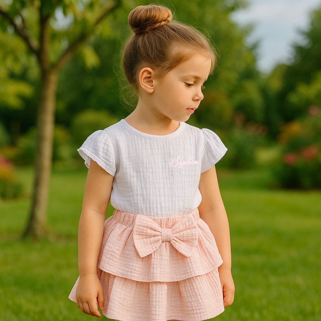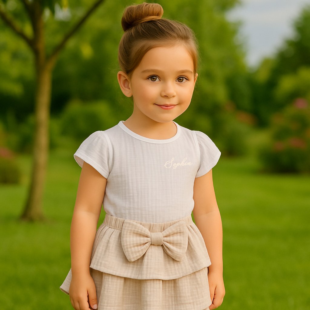 Krásná letní soupravička pro Vaše malé parádnice. Souprava se skládá z bílého trička s volánky a vyšitím jména a sukýnky ve dvou barvách.