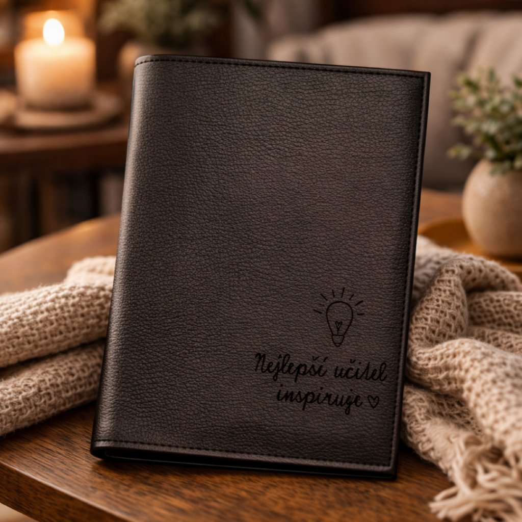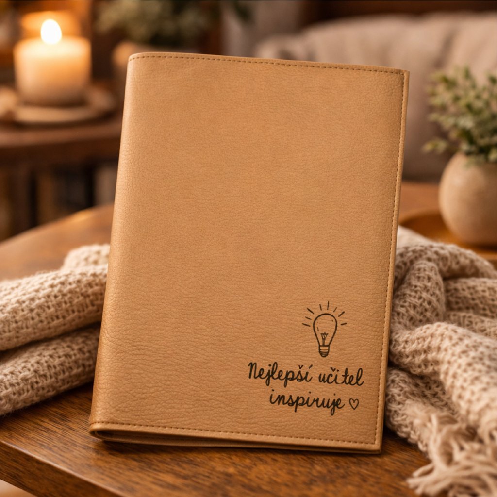 Koženkový obal na knihu s gravírovaným textem "NEJLEPŠÍ UČITEL INSPIRUJE", je krásný dárek pro každého milovníka knih.