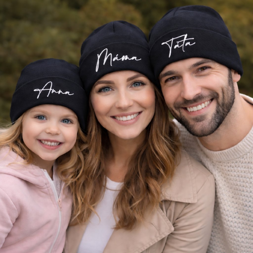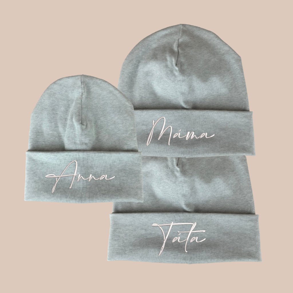 Párové čepičky z hladkého úpletu a výšivku vlastního jména na dětskou čepičku v té nejvyšší kvalitě. Je krásně pružná a poddajná. Detail čepičky tvoří stylová výšivka jména Vašeho děťátka.