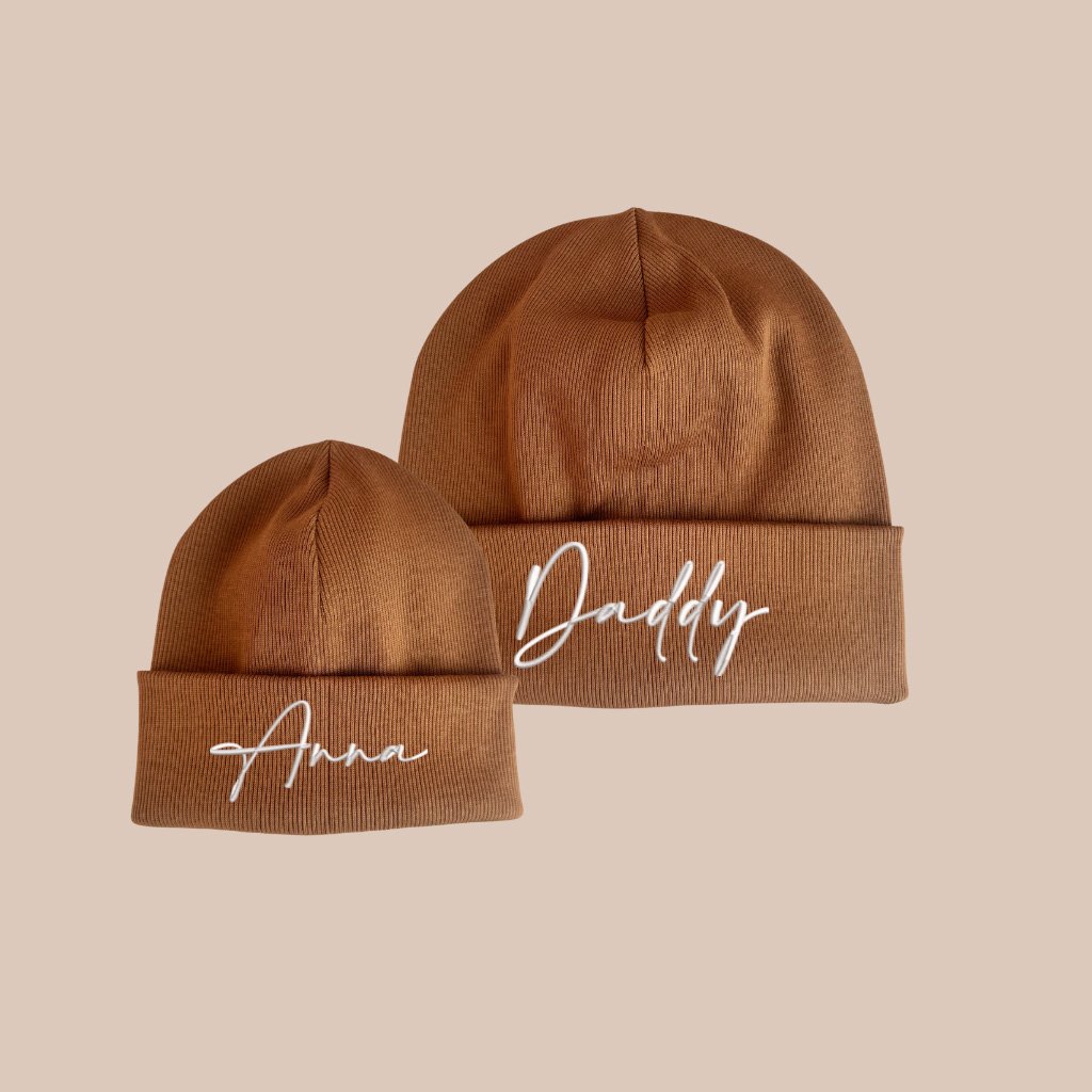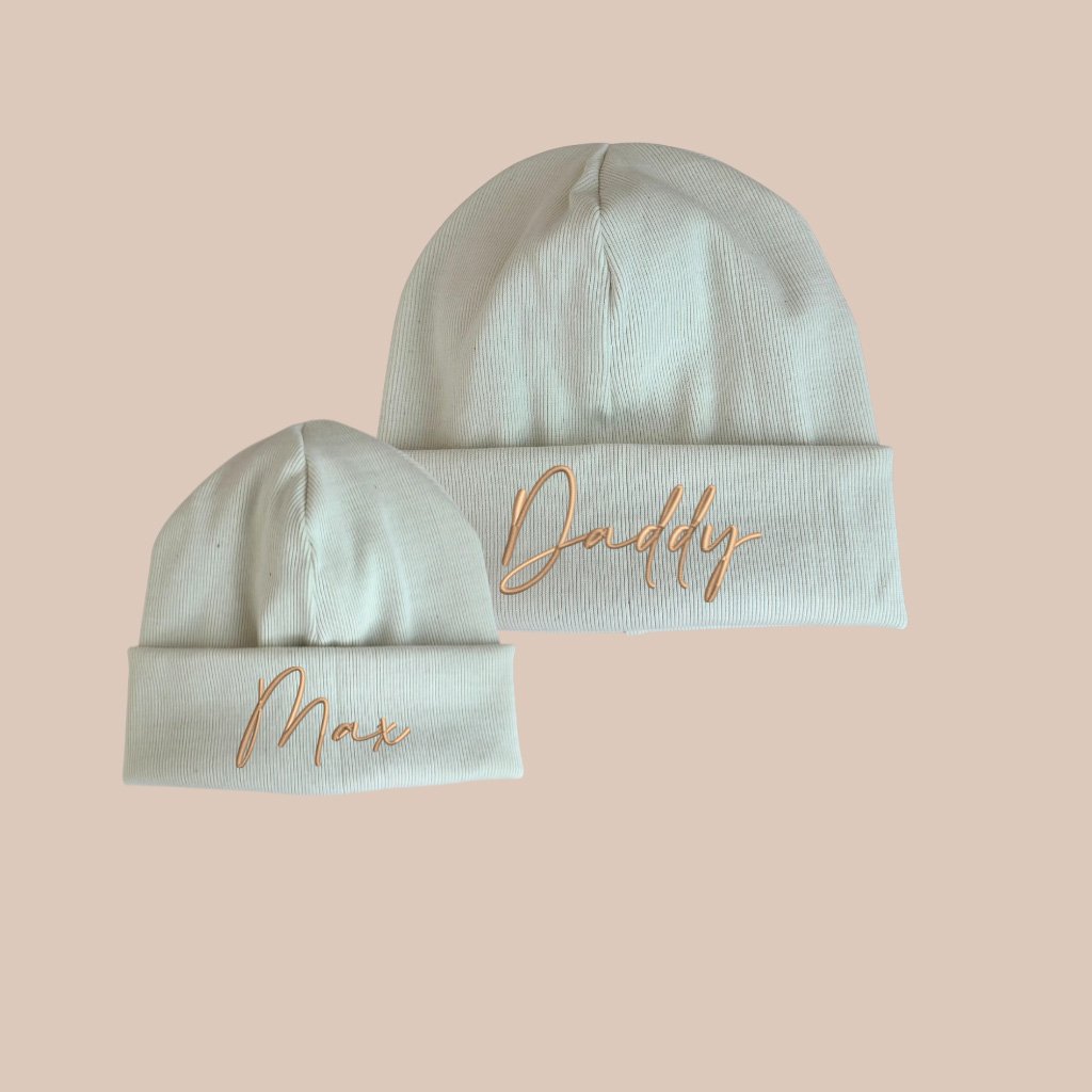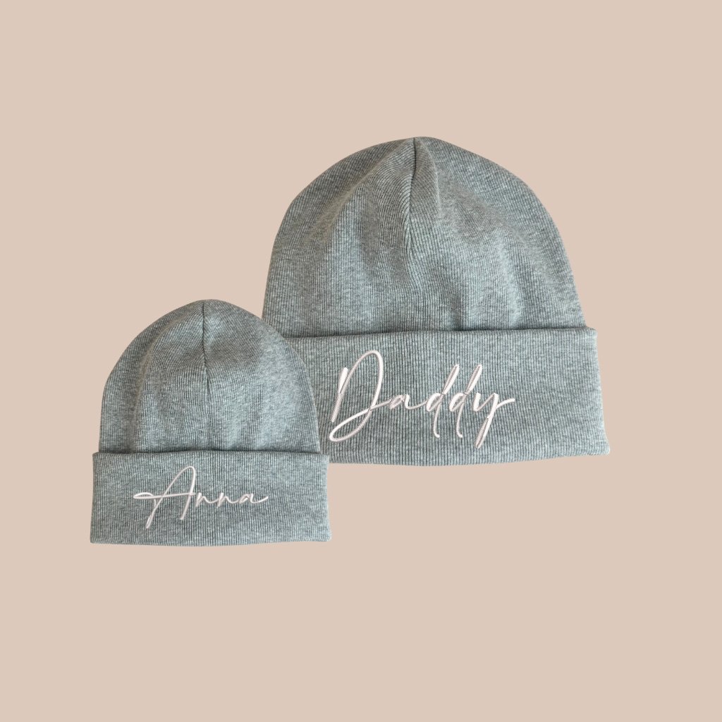 Párové čepičky z vroubkovaného úpletu a výšivku vlastního jména na dětskou čepičku v té nejvyšší kvalitě. Je krásně pružná a poddajná. Detail čepičky tvoří stylová výšivka jména Vašeho děťátka.