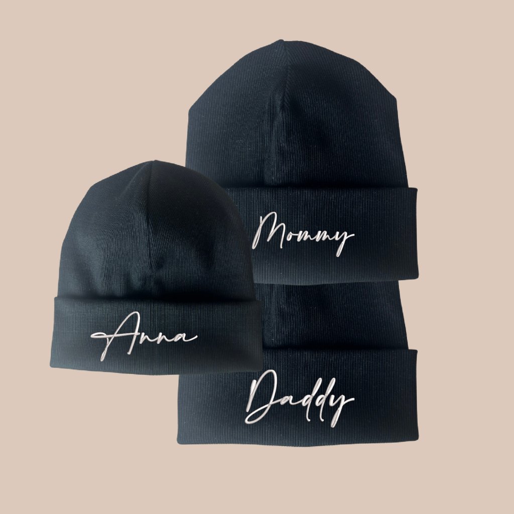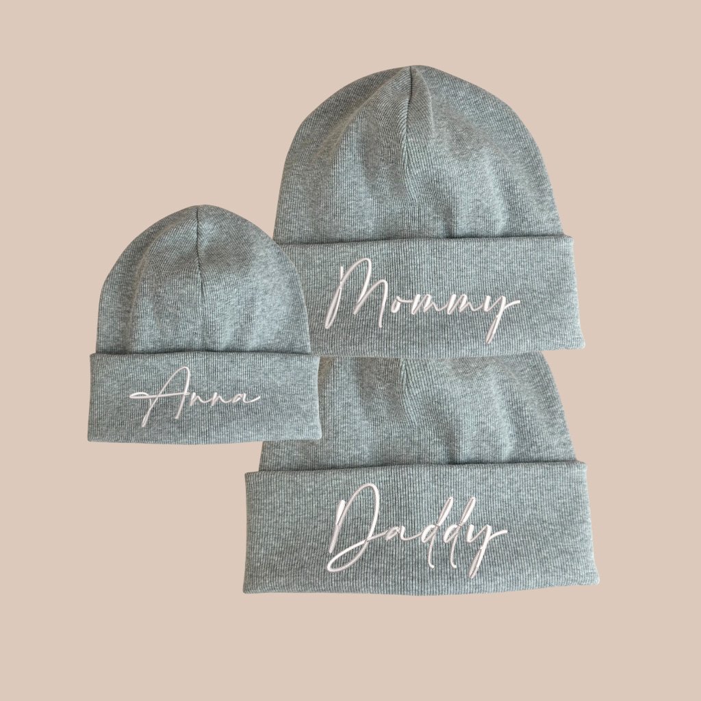 Párové čepičky z vroubkovaného úpletu a výšivku vlastního jména na dětskou čepičku v té nejvyšší kvalitě. Je krásně pružná a poddajná. Detail čepičky tvoří stylová výšivka jména Vašeho děťátka.