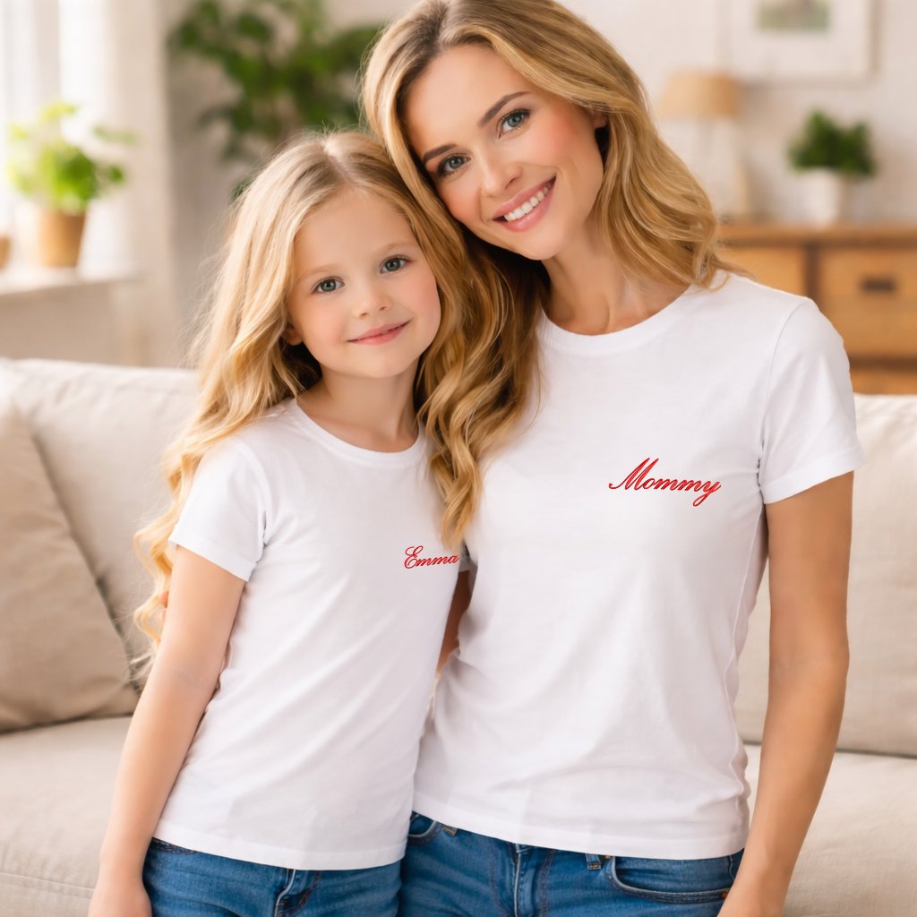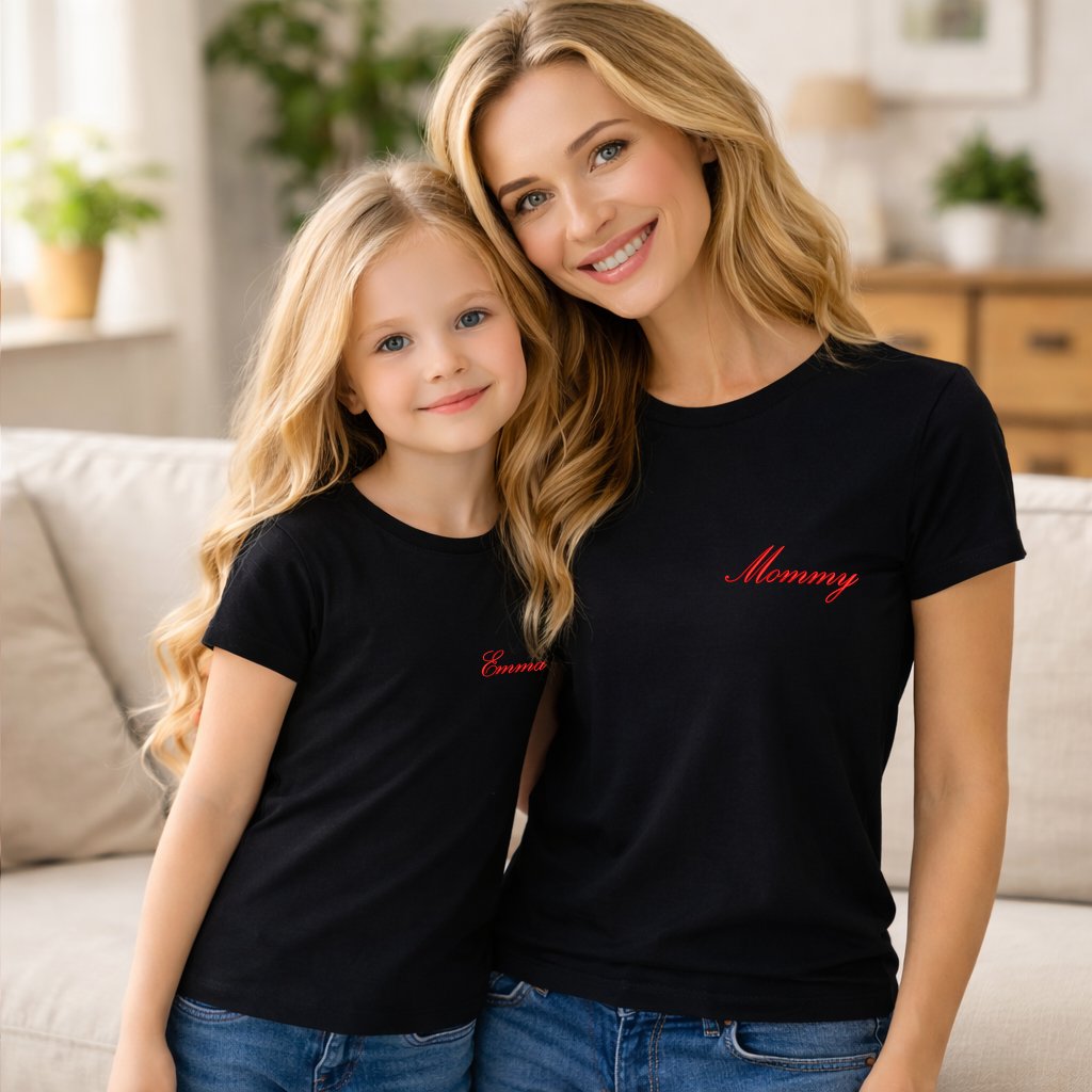 Párové trička pro mámu a dítě. Na tričku pro maminku je elegantním psacím písmem vyšité Mommy a na tričko pro dítě je vlastní jméno.