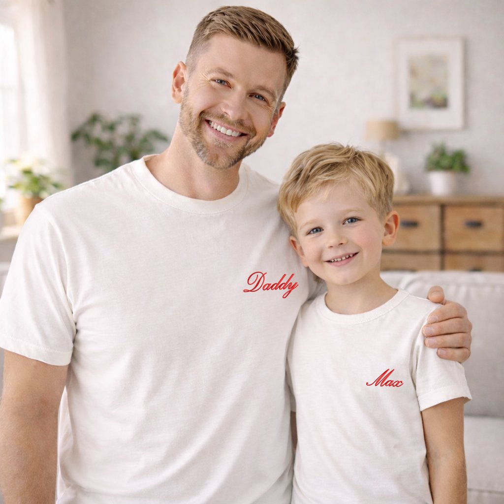Párové trička s červenou výšivkou jména pro tátu a dítě