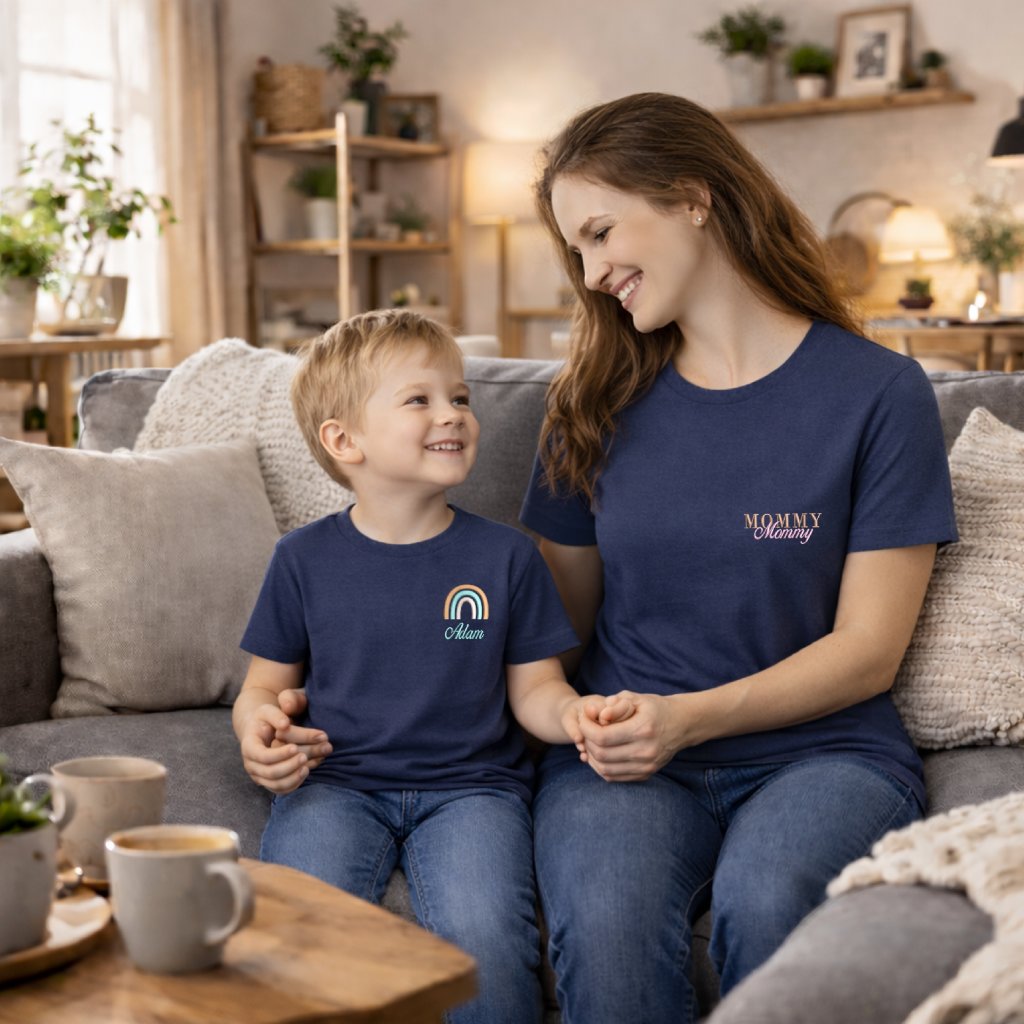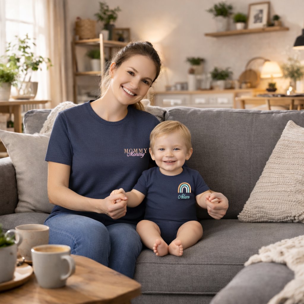 Na maminčiném tričku je dvojitě přešívaná výšivka Mommy a na dětském tričku duha nebo medvídek s vlastním jménem dítěte.