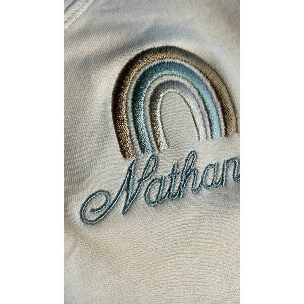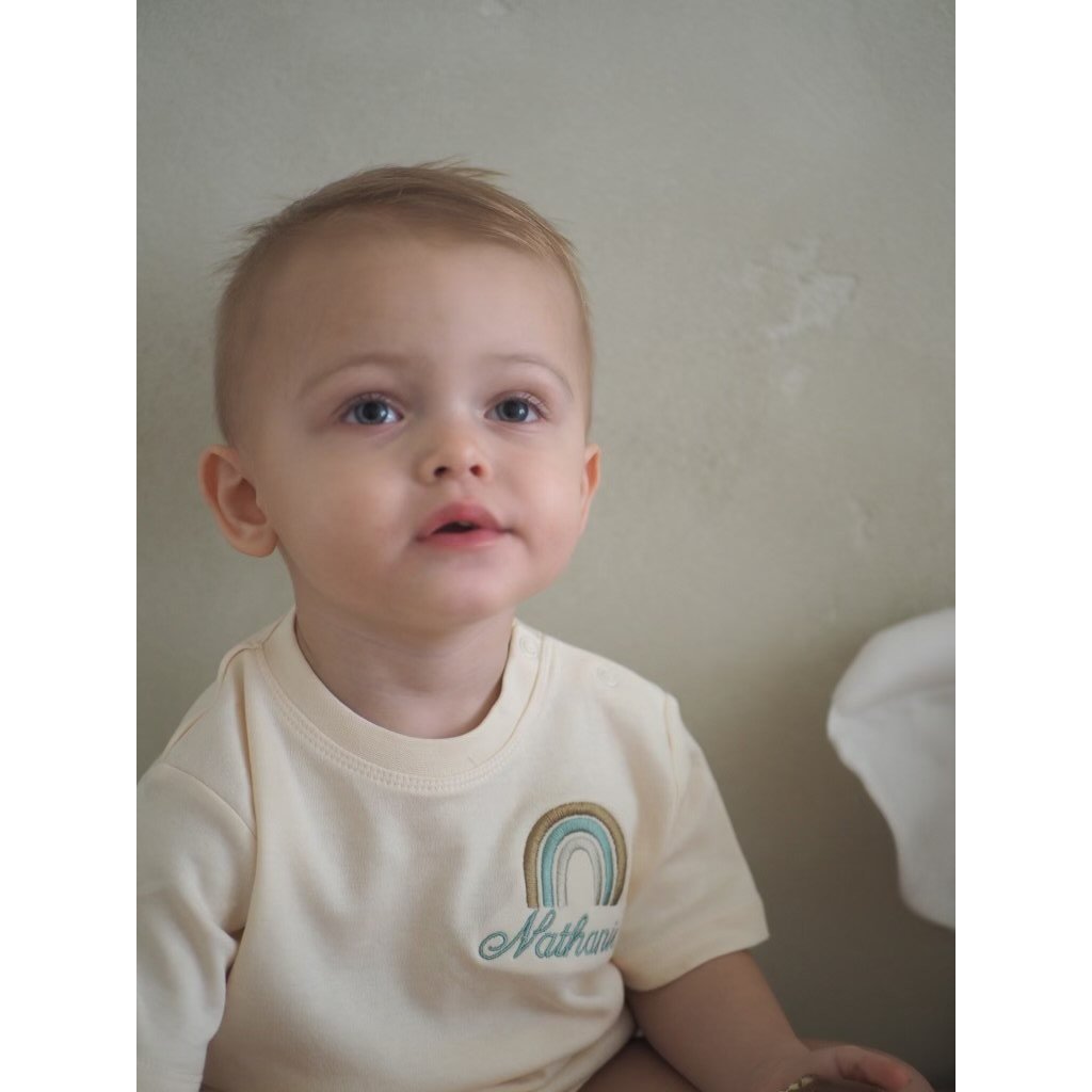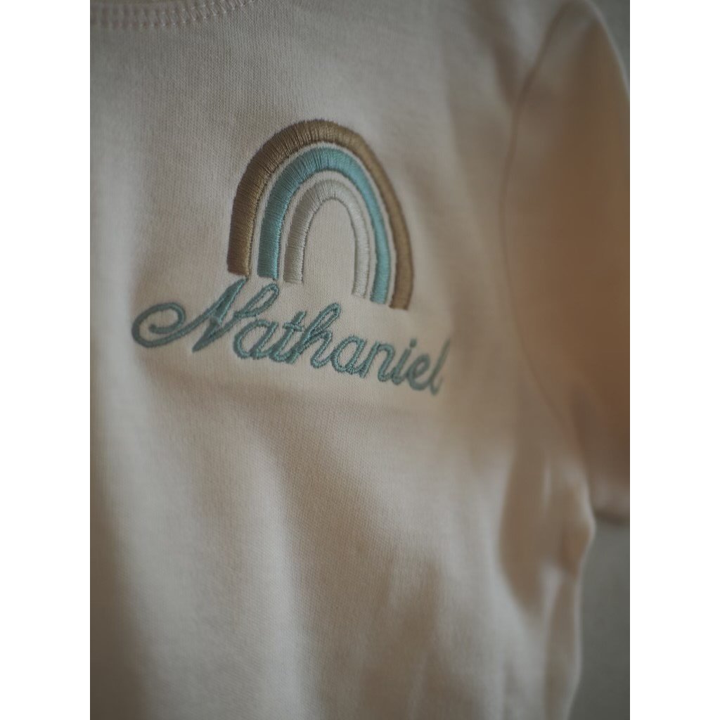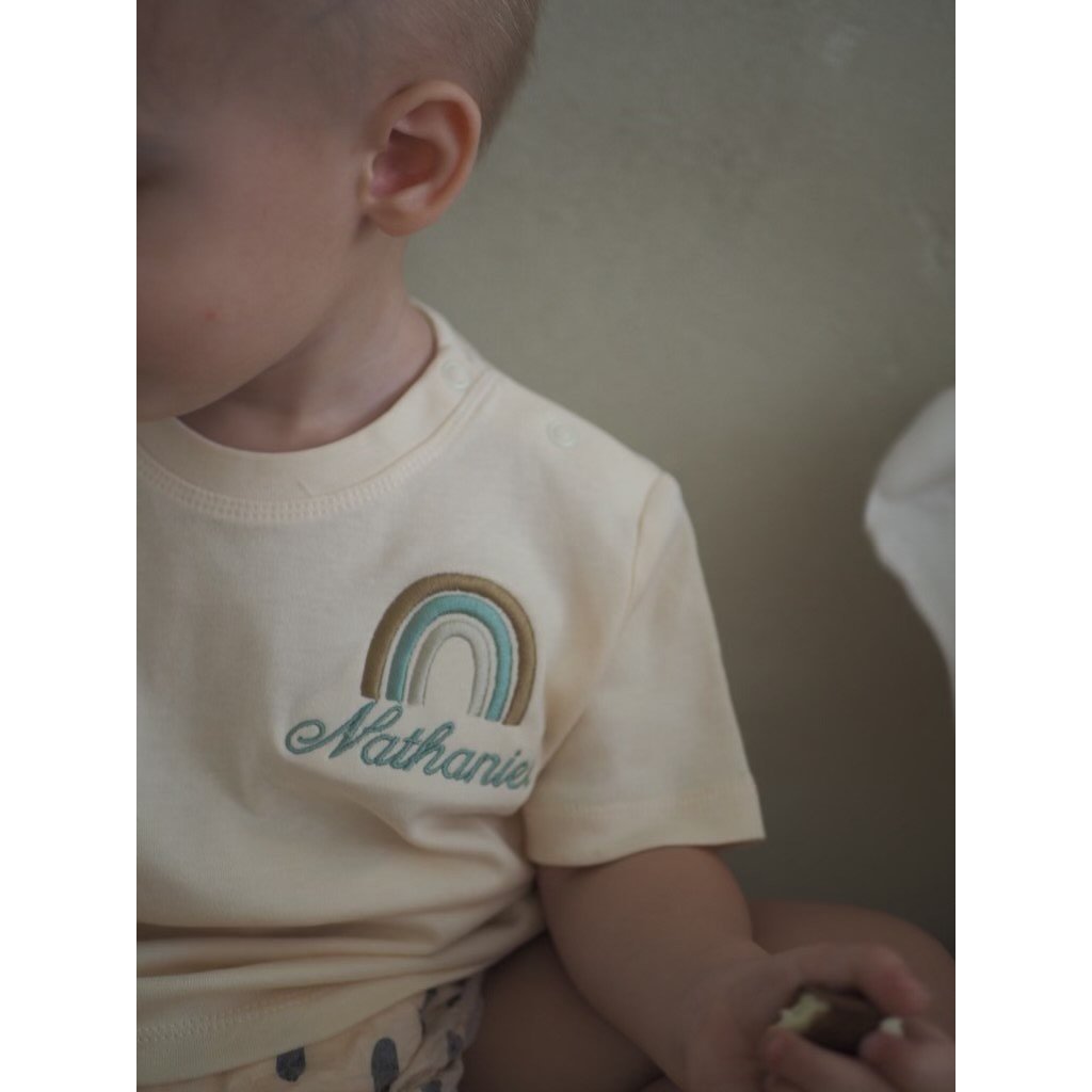 Na tatínkově tričku je dvojitě přešívaná výšivka Daddy a na dětském tričku duha nebo medvídek s vlastním jménem dítěte.