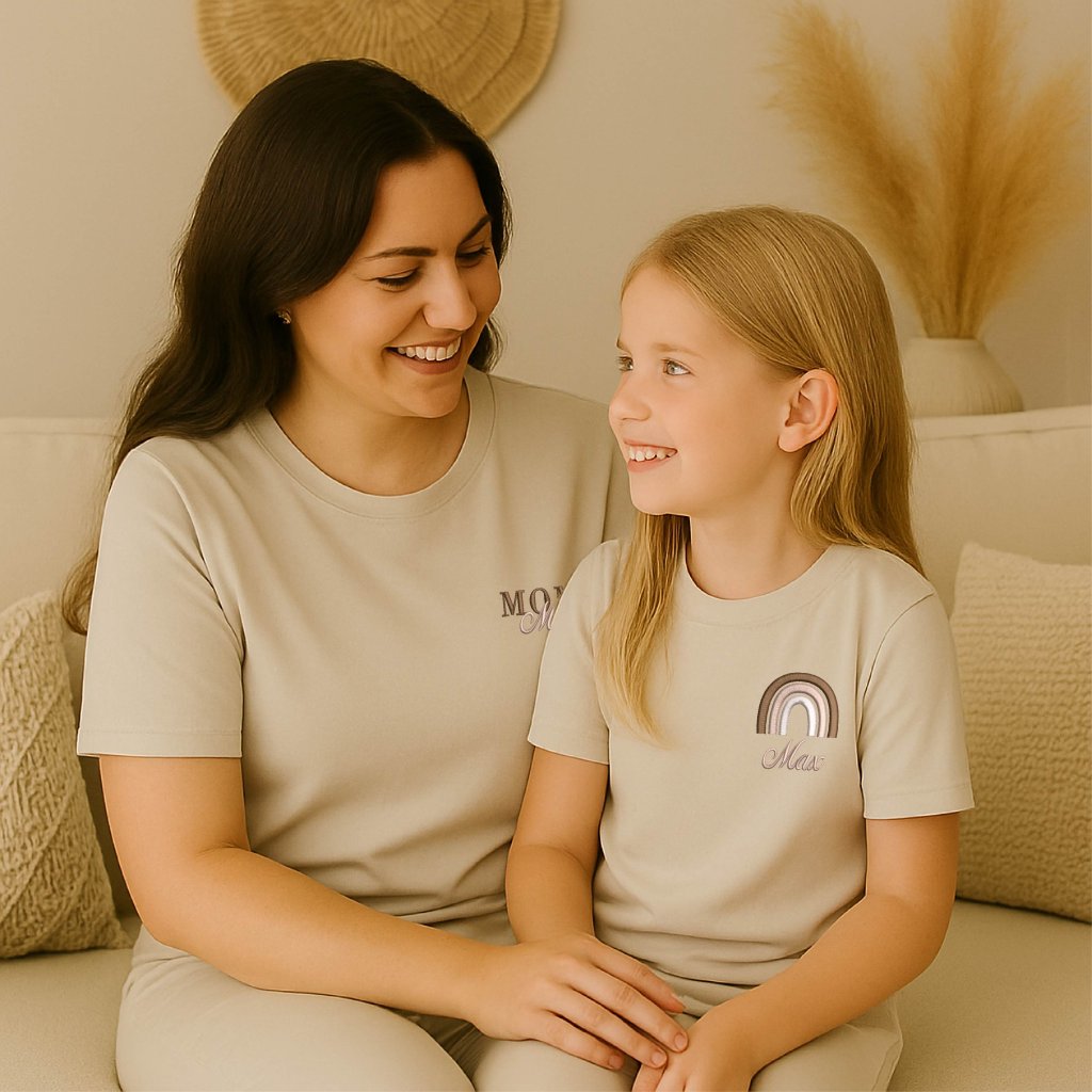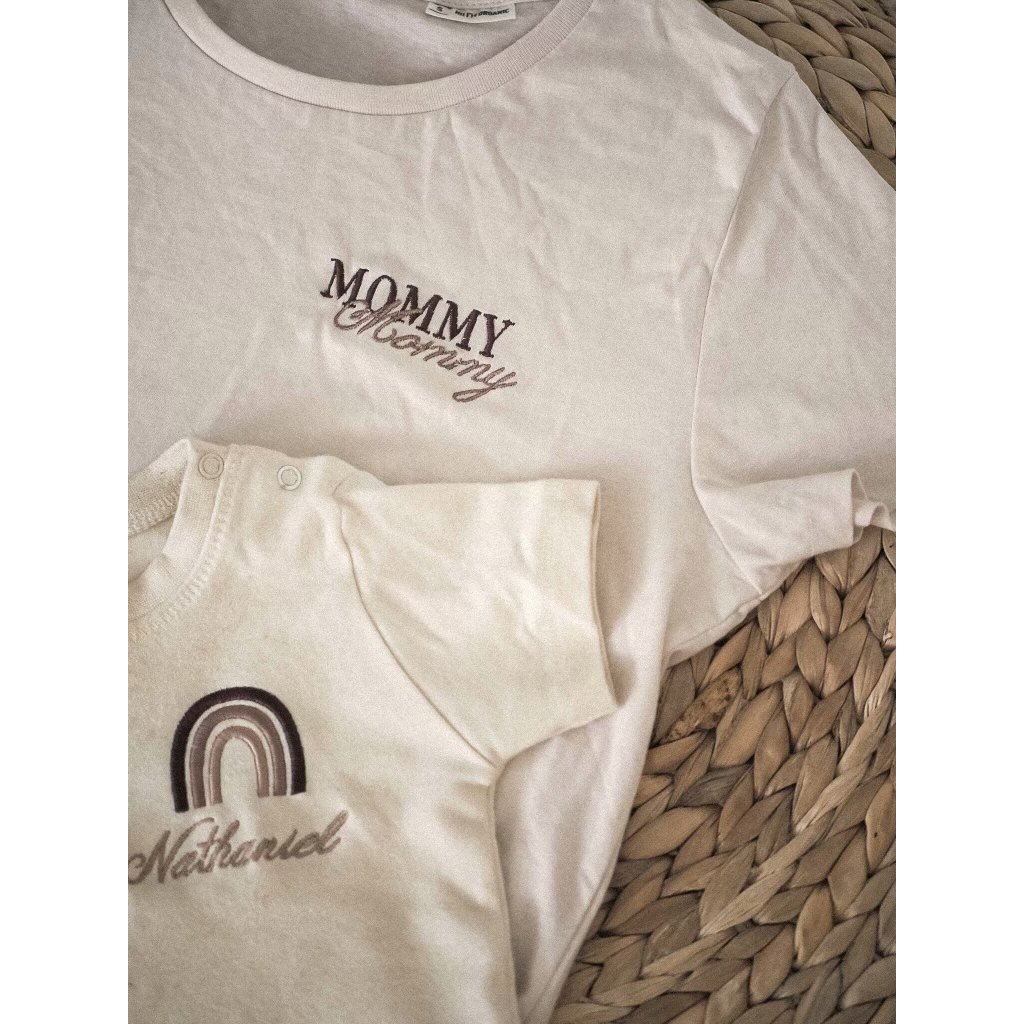 Na maminčiném tričku je dvojitě přešívaná výšivka Mommy a na dětském tričku duha nebo medvídek s vlastním jménem dítěte.